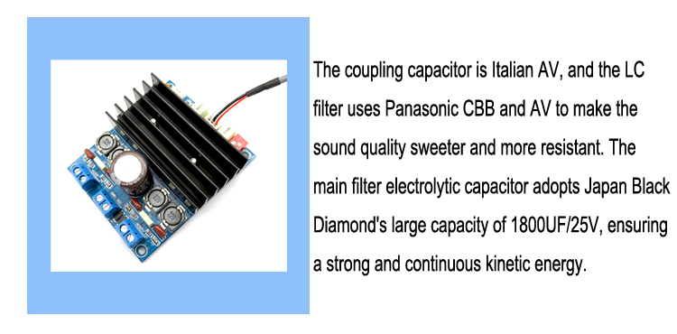 1. Coupling capacitor adopts Italian AV, LC filter adopts Panasonic CBB and AV, which makes the sound quality more sweet and resistant. The main filter electrolytic capacitor adopts Japanese black diamond large capacity 1800UF/25V, ensuring strong and continuous movement. |