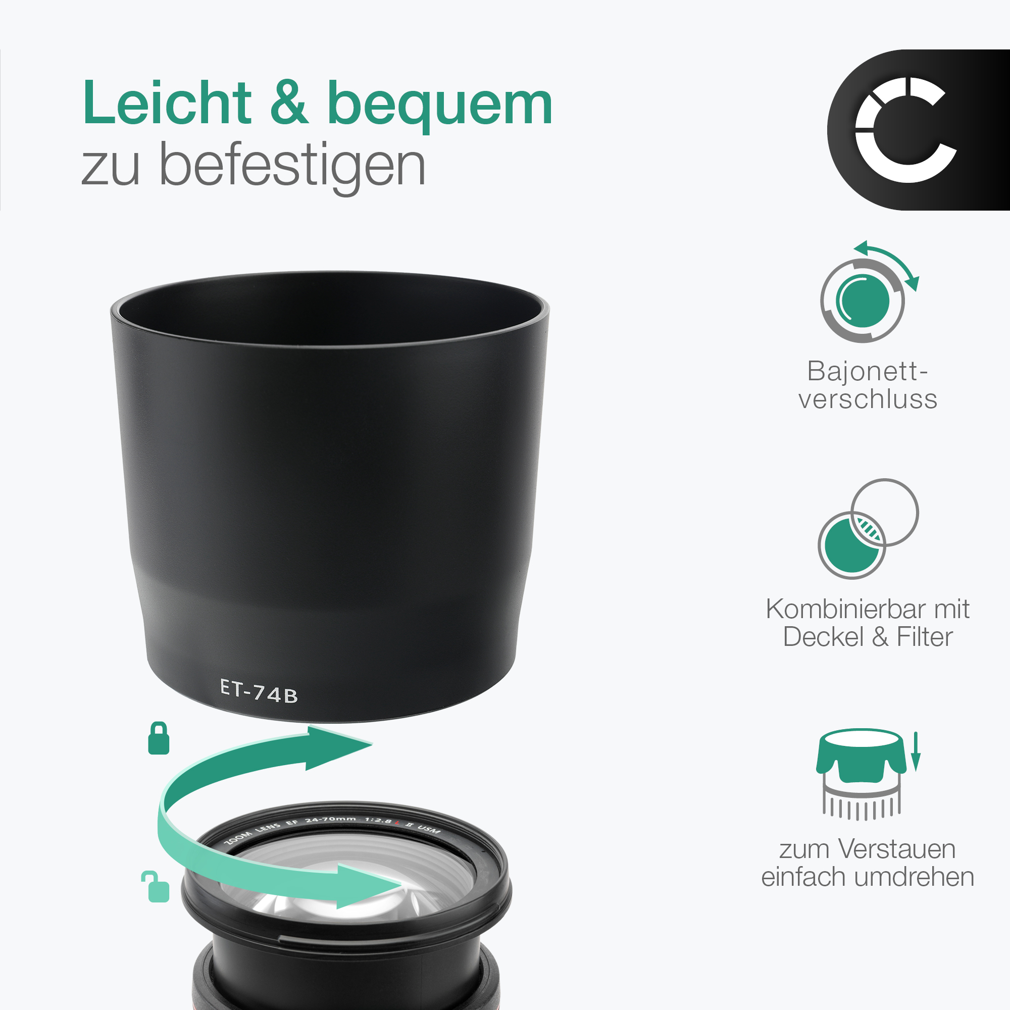 ✔ Kann zum Verstauen auch umgedreht am Objektiv angebracht werden