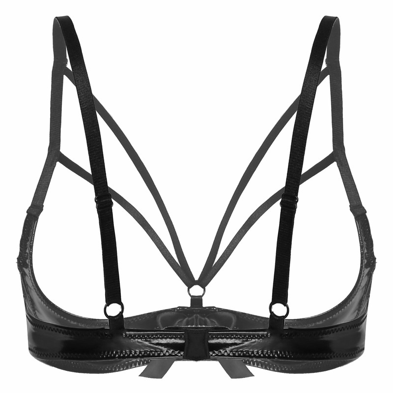 Women Strappy Open Cup Patent Leather Bowknot Underwired Bra Tops.