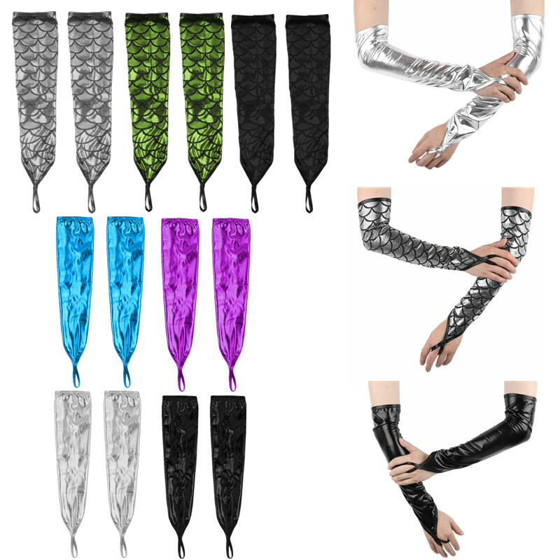 Elbow length, fingerless style with a loop at the middle finger. Allover with metallic fish-scale printed pattern.