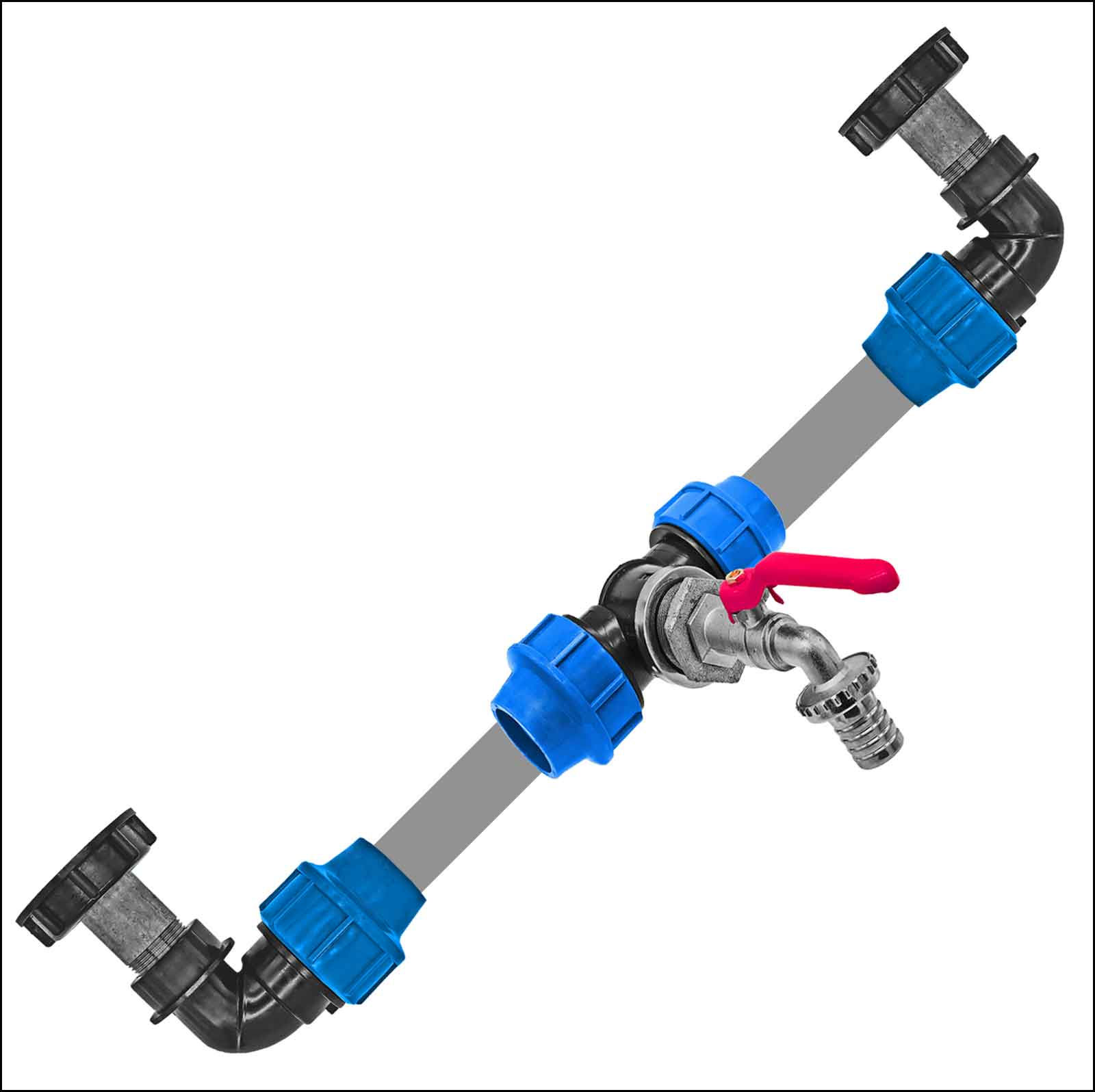 Beispiel 2 Stück IBC-Tanks verbinden mit Auslaufhahn: Das hier angebotene T-Stück mit Auslaufhahn. An diesen T-Klemmverbinder beliebiges Rohr (HT-Rohr, Kupferrohr, Stahlrohr, PE-Rohr) mit 40mm Außendurchmesser(DN40) montieren. An den entstehenden Enden Winkel IBC Adapter bei 2 Tanks oder T-Stück für mehr Tanks anschließen. Montage Vorschläge Bilder siehe unten.