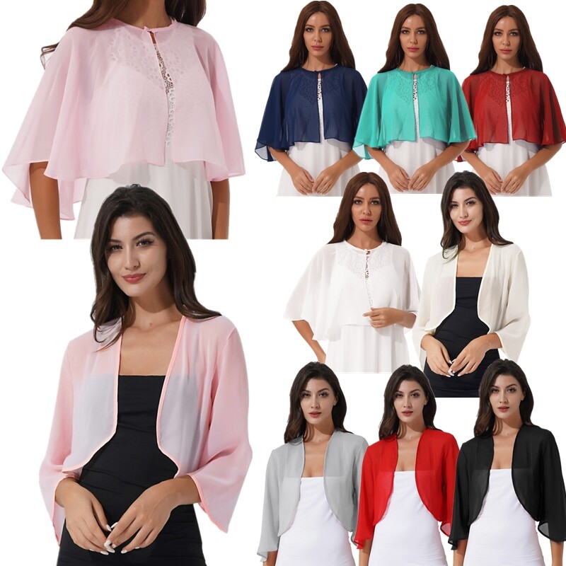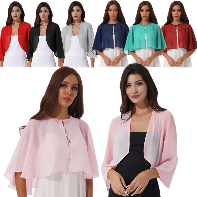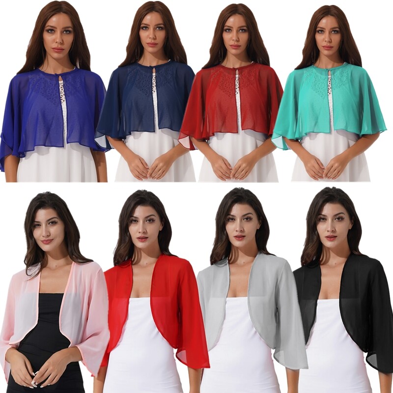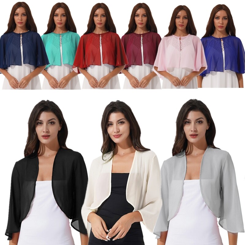 Women Elegant Chiffon Cardigan Wraps Shawls Wedding Evening Party 3/4 Sleeve Cape Bridal Dress Cover Ups.