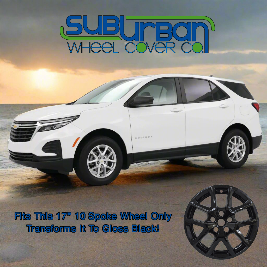 This listing is for a brand new set of (4) gloss black wheel skins for 2022-2024 Chevrolet Equinox LS and LT models with the matching 10 spoke 17" aluminum wheels only (see vehicle photo). This wheel is required for installation. Simply remove the stock button center caps from your wheels and snap it right on top of your wheel. Then re-install your stock center caps and instantly your stock wheels will be transformed to black. Your existing Chevrolet center caps will show through the opening in the middle for a factory appearance. Installation is simple and takes seconds to install. The price quoted is for a complete set of 4. The photo's showing the center caps are to show you what the finished product looks like. The center caps are not included.