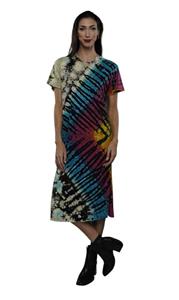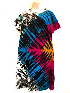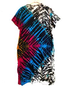 Artsy clothing for expressive women! Presenting classic gypsy hippie chick bohemian shabby chic styles for creative women. Handmade boutique styles at affordable prices. 100% Rayon mudmee tie dye long gypsy peasant festival dress with 10 inch side slits and 2 side pockets. Very versatile. The model is just to give you an idea of what the garment might look like on but the item hanging in the separate picture is the one you will receive. Check the measurements below.
