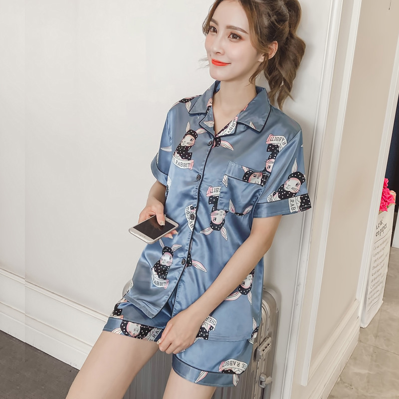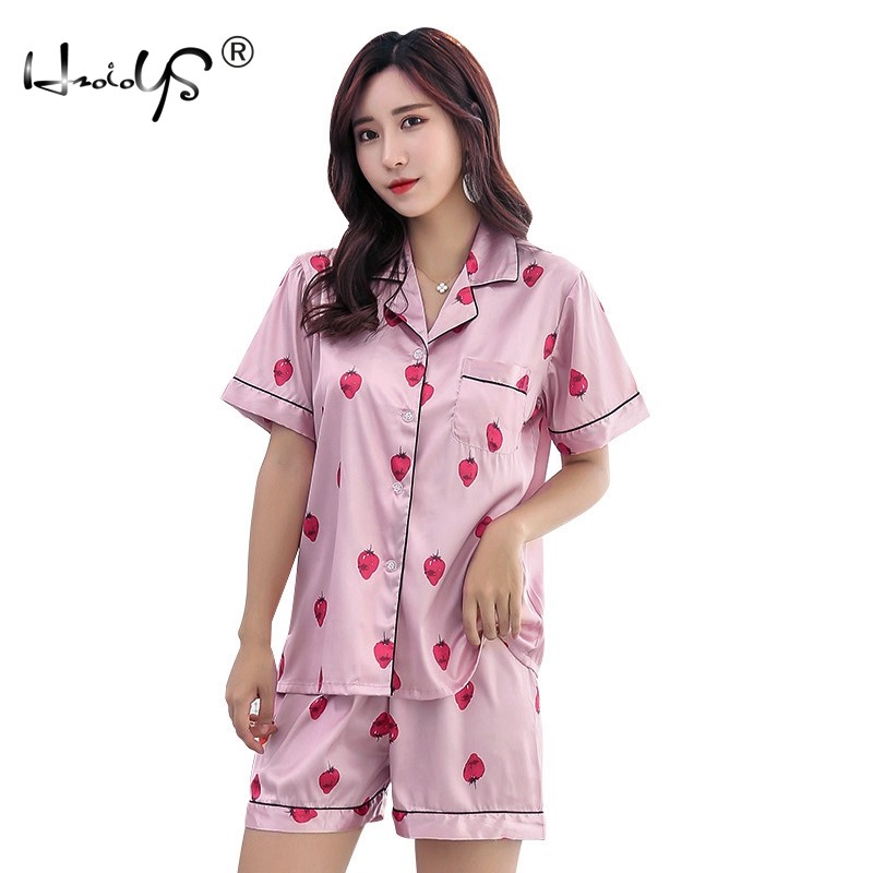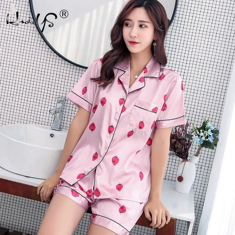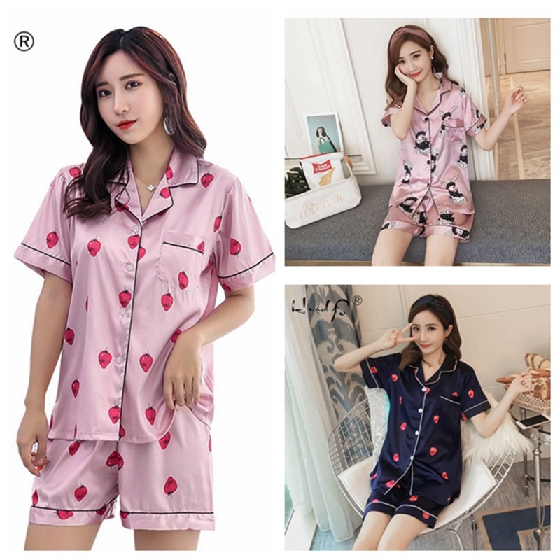 Women's Silk Satin Pajamas Set Short Sleeve Button-Down Print Sleepwear Homewear
