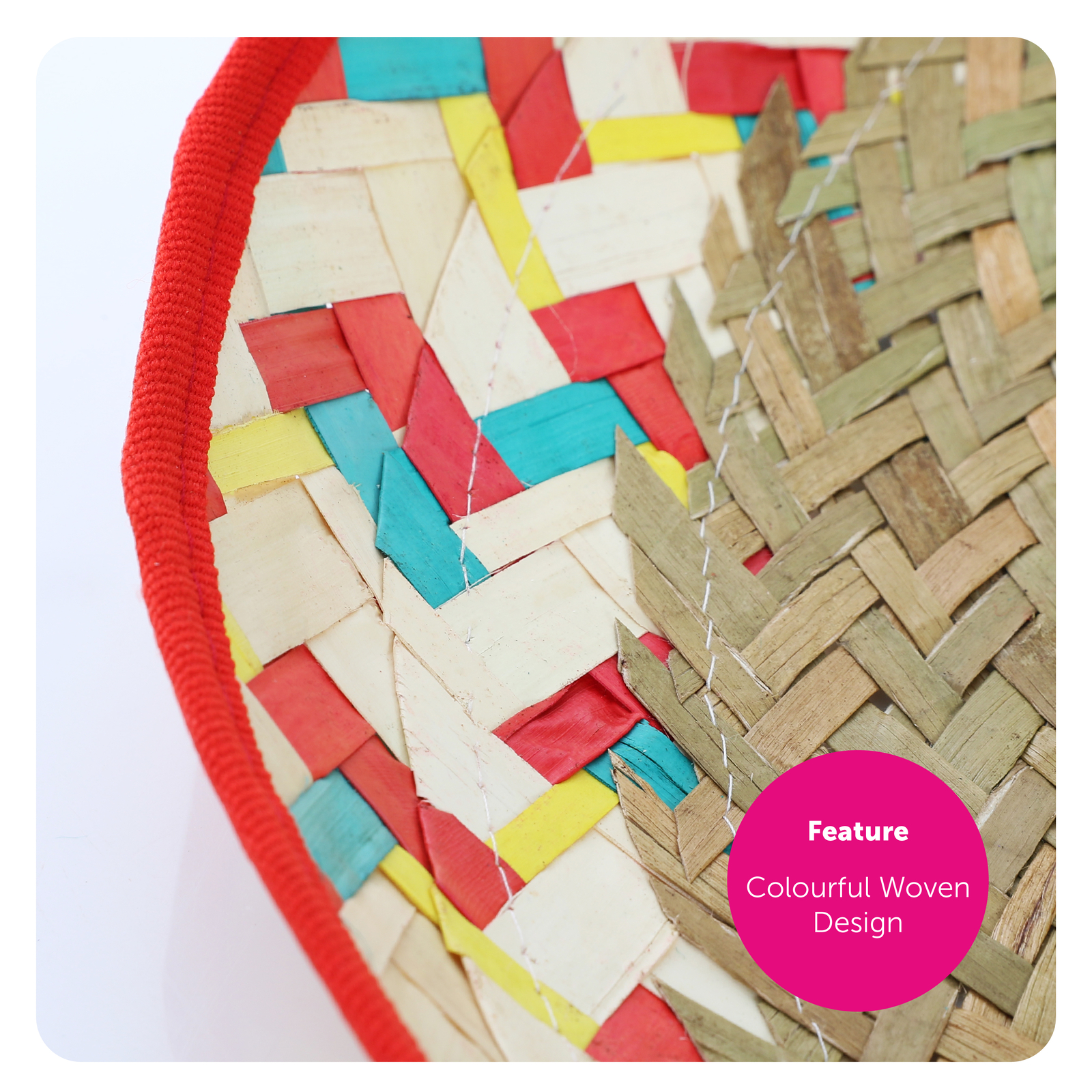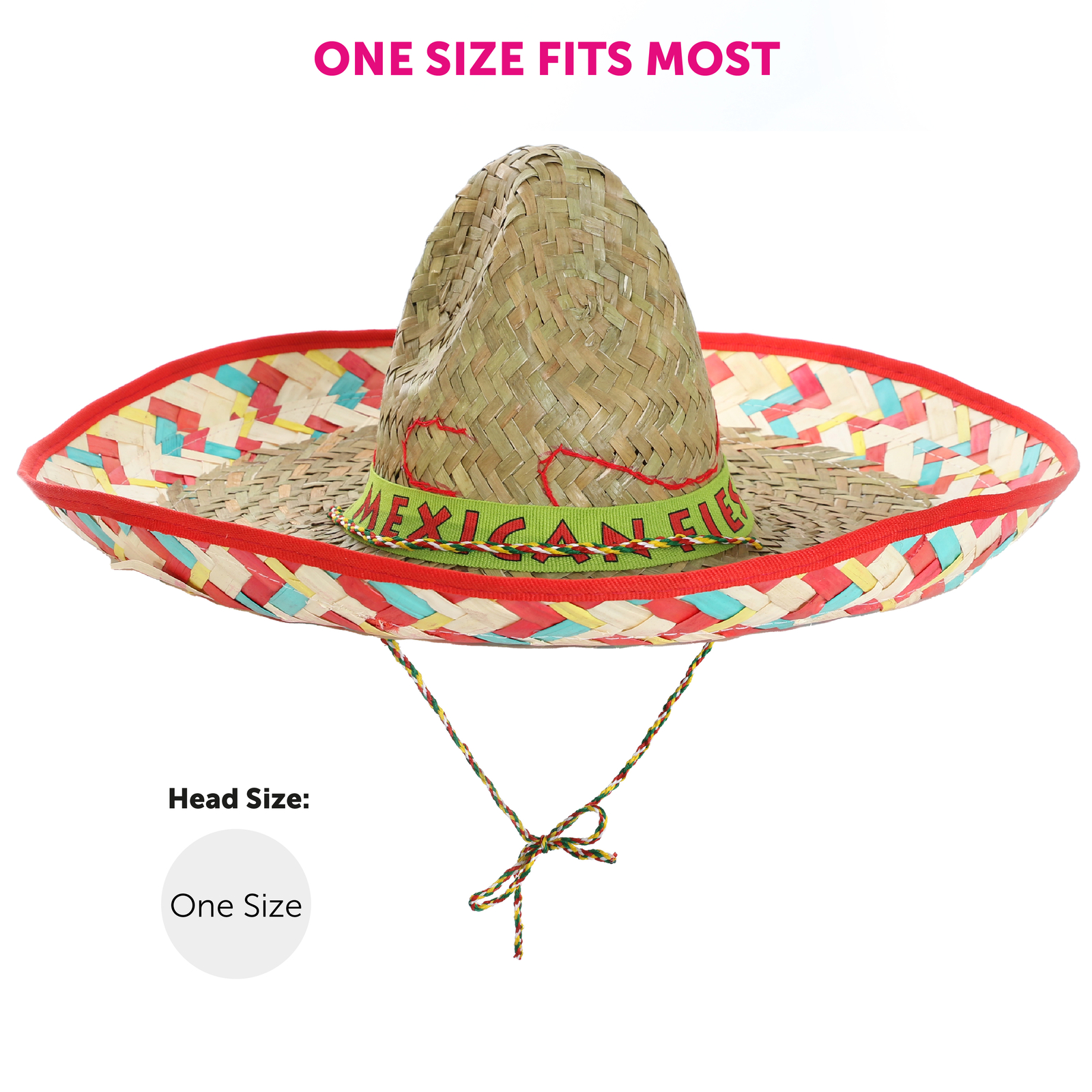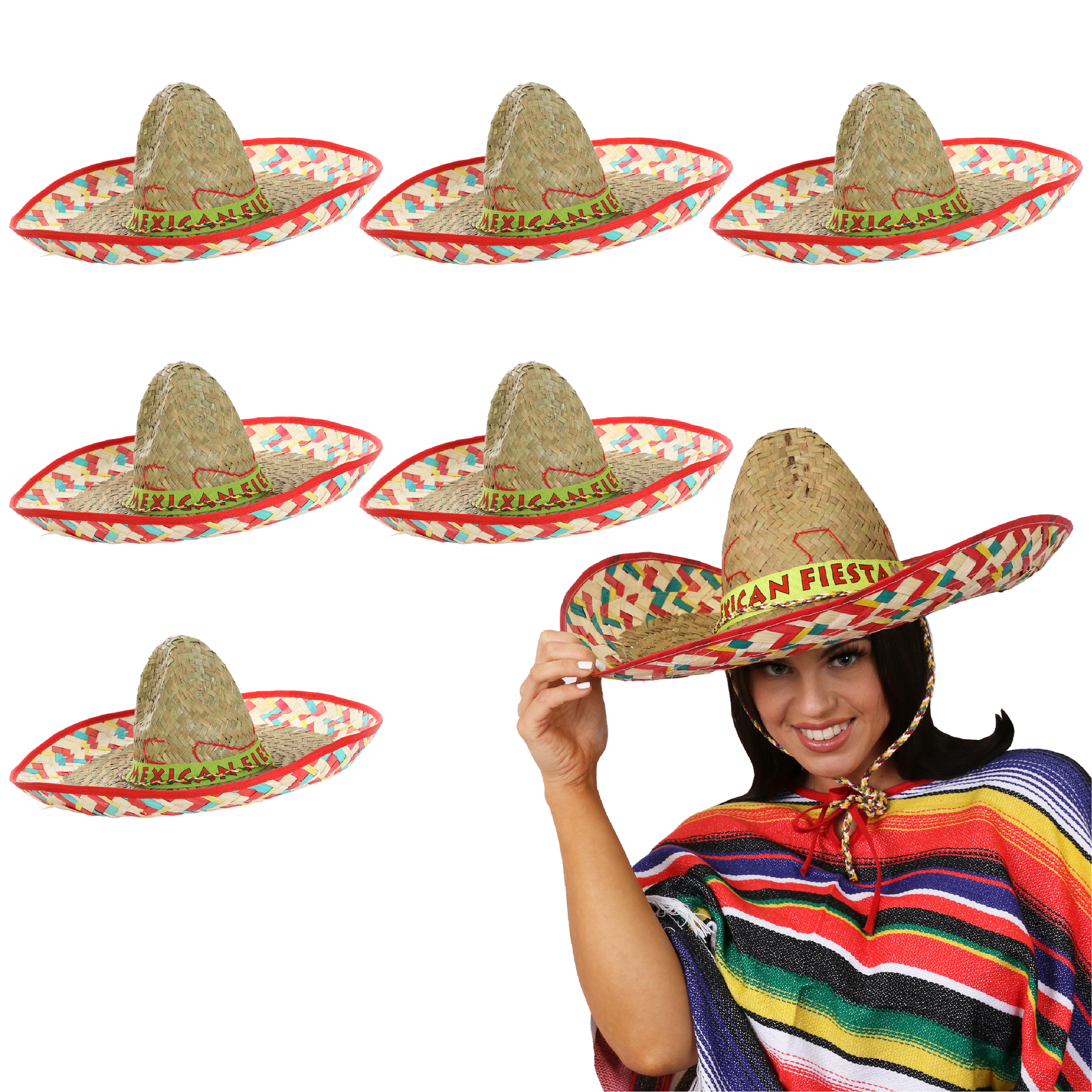 INCLUDES:PACK OF 6 NATURAL STRAW COLOUR SOMBREROS WITH RED AND GREEN CHEVRON DESIGN AROUND EDGE OF HAT