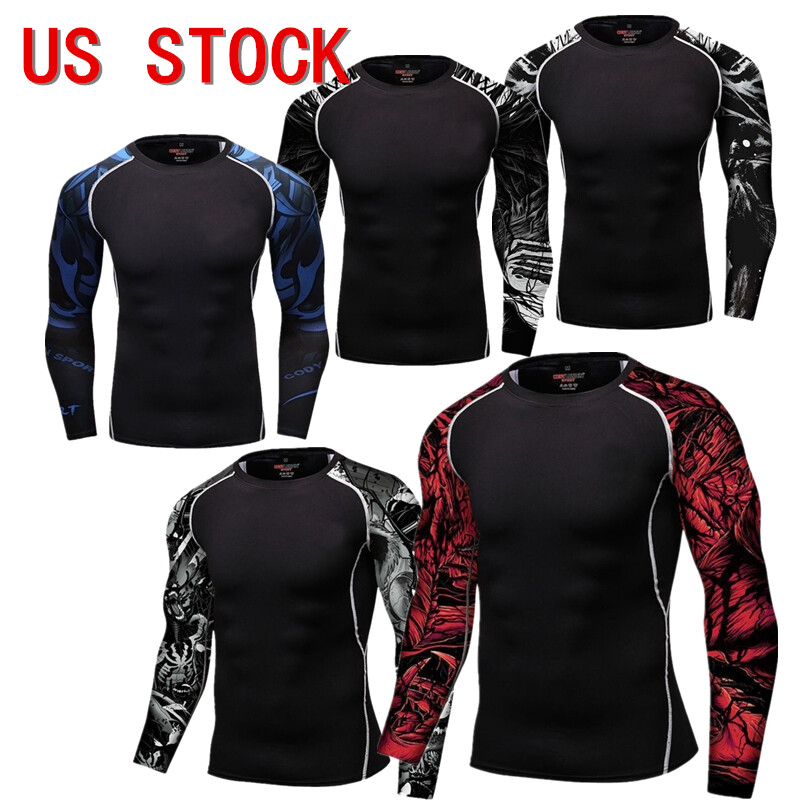 Mens Quick-drying Athletic Sports T-shirt Stylish Print Crew Neck Long Sleeve Tops.