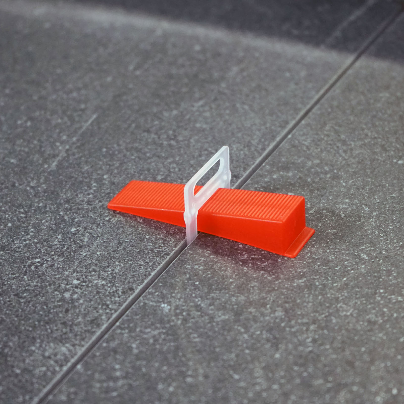 Pour ce procédé, les cales se combinent avec des croisillons autonivelants correspondants (non inclus à la livraison) et s'utilisent comme suit : d'abord le croisillon se place dans la jointure. Ensuite le carreau voisin se met en place, la cale s’enfonce à travers le croisillon à l’aide de la pince. Ce faisant, la cale s’enfonce à travers la languette jusqu’à ce que les deux carreaux aient atteint le même niveau de hauteur.
