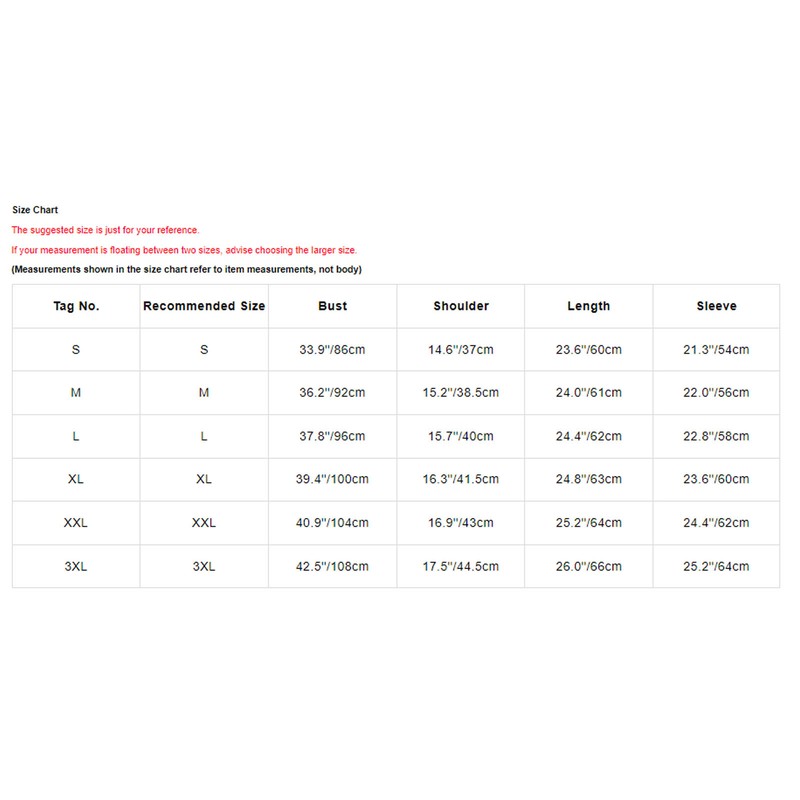| Tag No. | Recommended Size | Bust | Shoulder | Length | Sleeve |
