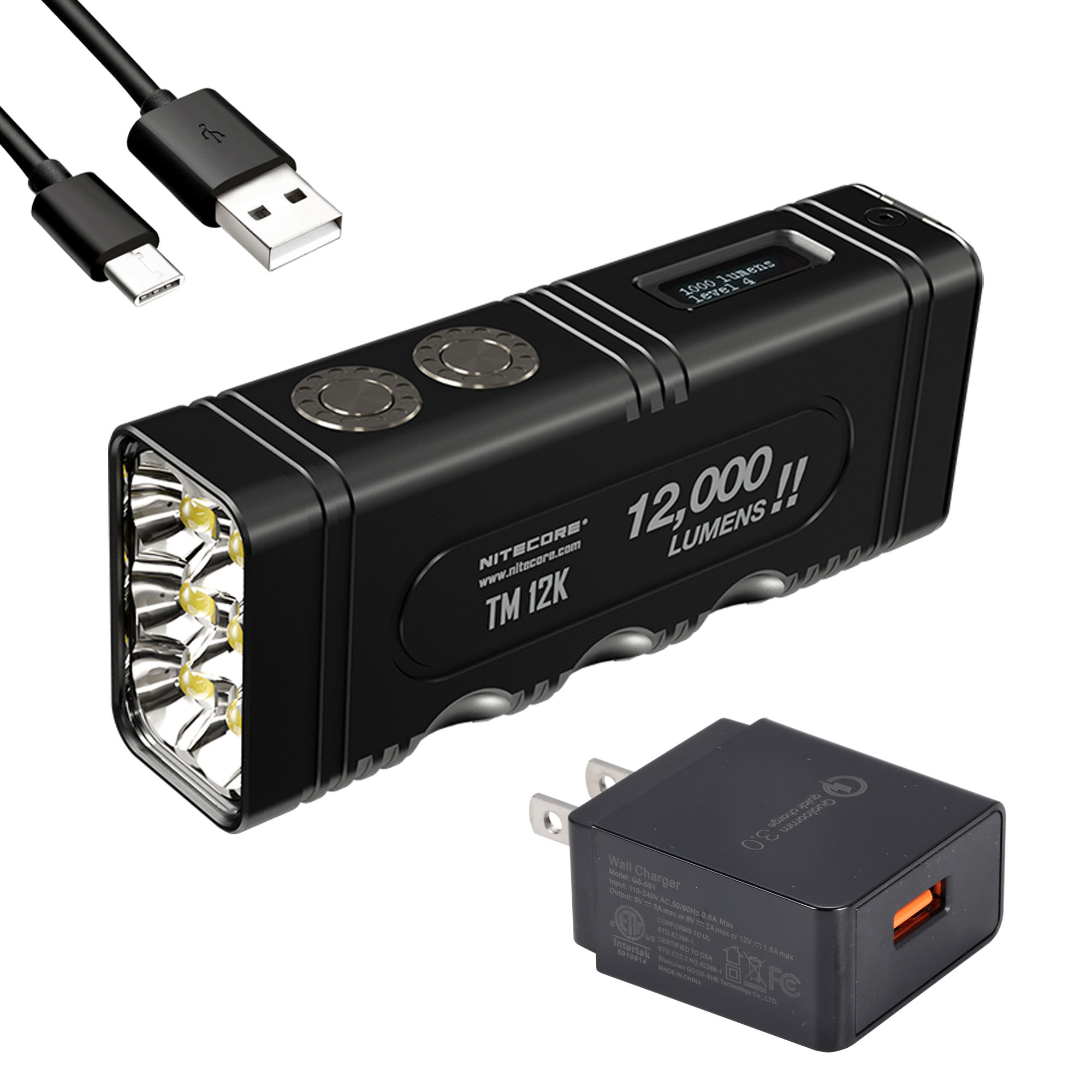 Contents in Package: NITECORE TM12K, USB Type-C charging cable, holster, lanyard, and QC3.0 charger adapter
