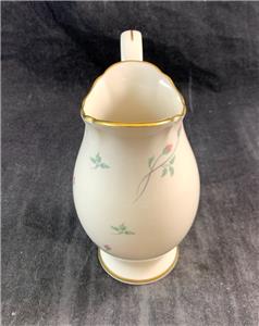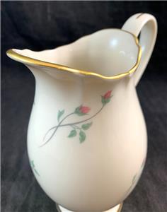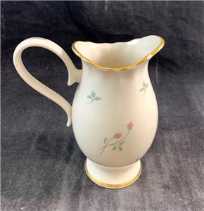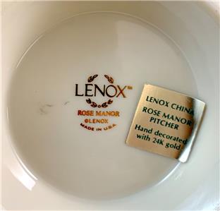 This pitcher made by Lenox features the Rose Manor Pink pattern which includes hand decorated pink flowers and green leaves on a cream background with a 24 karat gold trim.