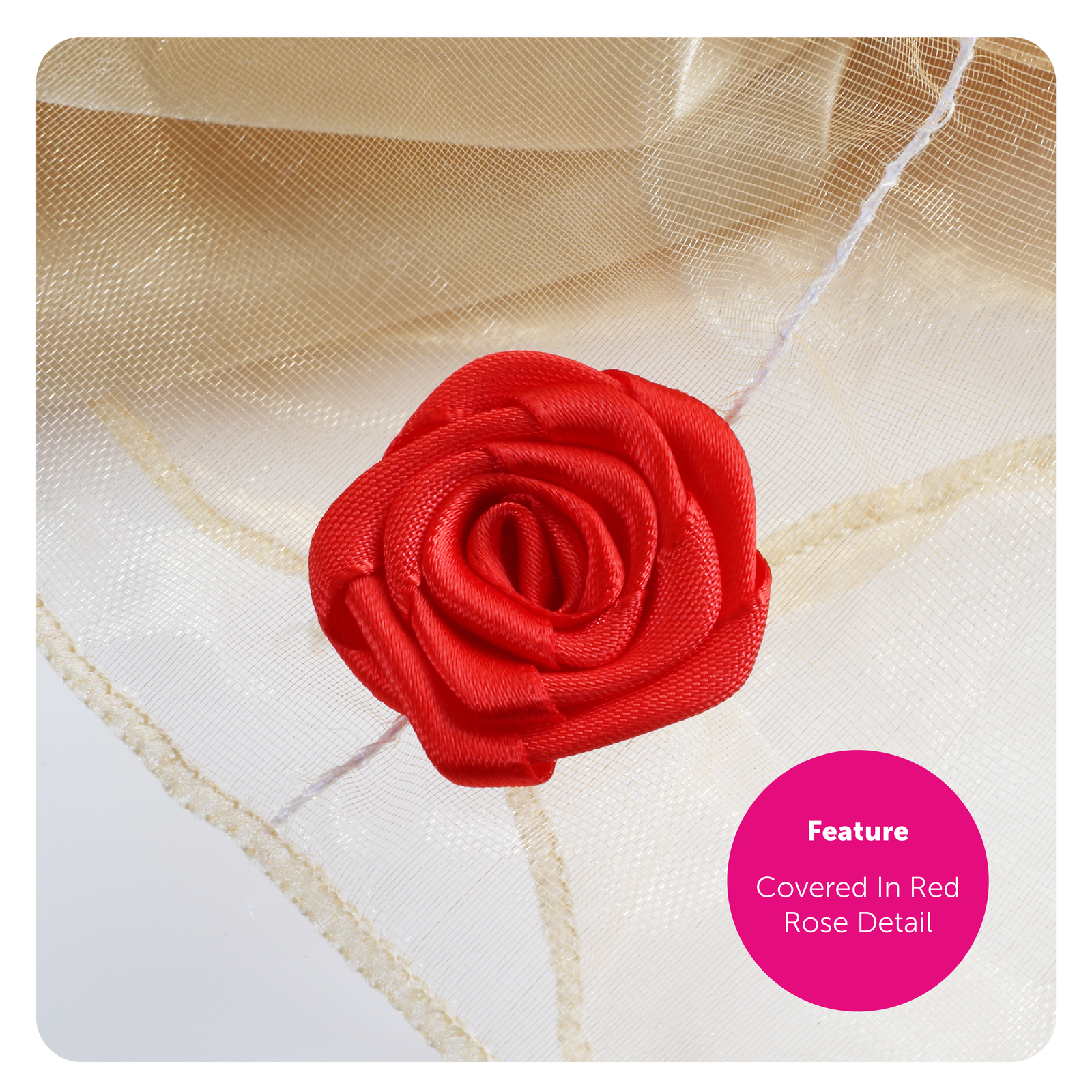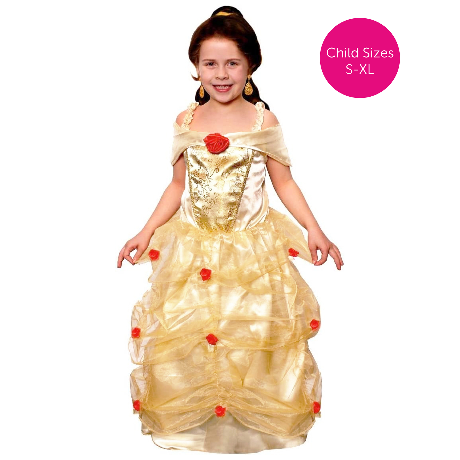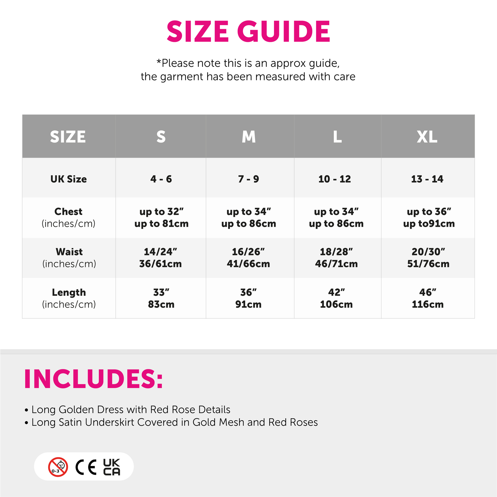 GOLDEN COSTUME INCLUDES: Your Golden Princess Fancy Dress Costume includes a Golden dress, with a golden frilled skirt with Red Rose details, and Satin Gold textured detailing on the body for an elegant look!