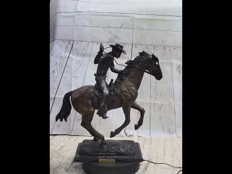 Crafted with unwavering attention to detail, this exceptional sculpture is meticulously handmade from 100% bronze, ensuring its lasting quality and durability. The renowned "Lost Wax Method" was employed in the casting process, capturing the intricate textures and nuances of the cowboy's attire and the horse's majestic form. Enhanced with a rich brown patina finish, the sculpture radiates warmth and authenticity. It proudly rests on a sleek black marble base, providing a sturdy foundation that complements the artwork's dynamic composition. The sculpture bears the signature of the esteemed artist, Fredrick Remington, further attesting to its artistic value and pedigree.