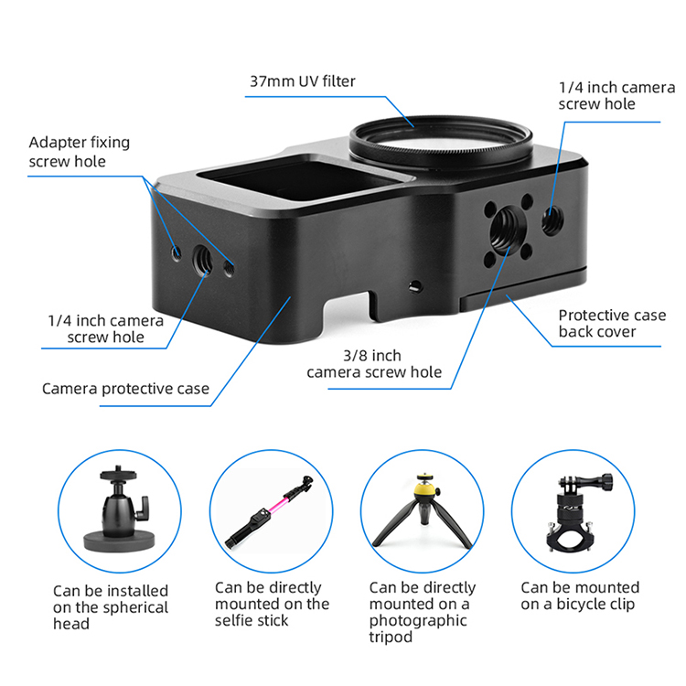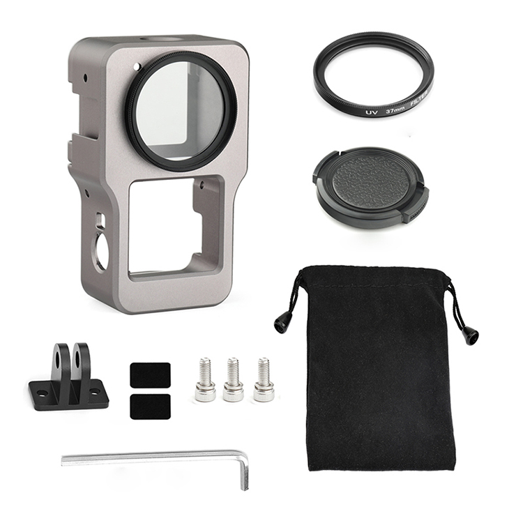 Features: l Made of high-quality materials, portable and durable l Tailor-made for Action 2 cameras, high protection, anti-oxidation l The protective frame is equipped with 1/4 inch, 3/8 inch screw holes and cold shoe interface, adding more plug-in functions to the protective case l Wide compatibility, such as tripods, selfie sticks, bicycle sports photography support clips, etc Specification: l Applicable Model: for DJI ACTION 2 l Material: Aluminum Alloy l Color: Black, Titanium(Optional) l Weight: About 113.8G l Size: About 8.8x5.9x2.2cm Package Includes: l 1x Camera Protection Frame l 1x UV Filter l 1x UV Filter Cover l 1x Adapter l 1x Protective Pad l 1x Fixing Screw l 1x Wrench l 1x Storage Bag
