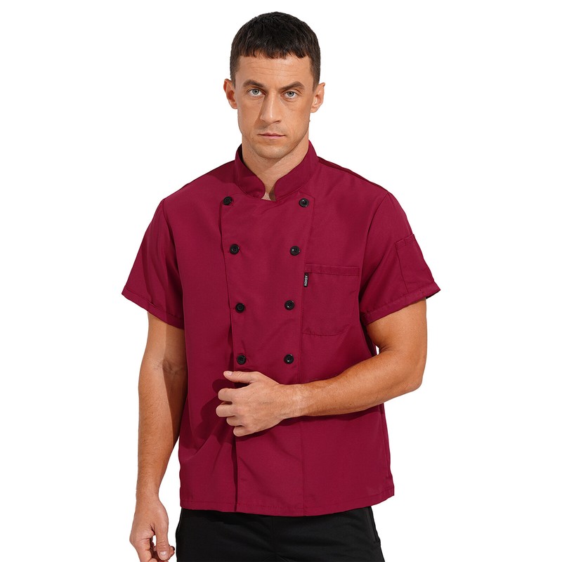 Double-breasted offers a classic look, short sleeve, stand collar, solid color, standard fit.