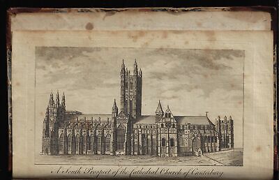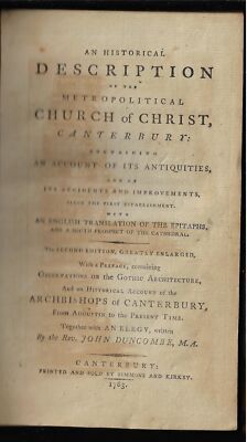 Duncombe, Rev. John. An Historical Description of the Metropolitical Church of Christ, Canterbury: Containing an Account of its Antiquities, and of its Accidents and Improvements, Since the First Establishment. With an English Translation of the Epitaphs, and a South Prospect of the Cathedral. The Second Edition, Greatly Enlarged, With a Preface, containing Observations on the Gothic Architecture, and an Historical Account of the Archbishops of Canterbury, From Augustin to the Present Time. Together with an Elegy, written by the Rev. John Duncombe, M. A. Canterbury: Simmons and Kirkby, 1783, second edition, 156 pp. Heavily worn boards with leather spine and corners, gilt titles and date on spine. Foxing thru out. Previous owner names. Frontispiece of the south prospect of the Cathedral Church of Canterbury. Binding is tight.