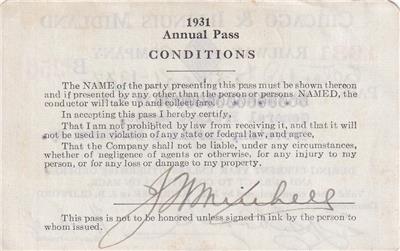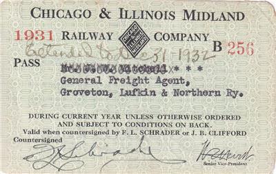 Items from the C&IM are not often found, but I offer for auction an employee pass for 1931-1932. It was issued to an officer of the Groveton, Lufkin & Northern Railway. The pass measures appx 4 x 2 1/2 inches and is printed on a linen paper. It is in very good condition, with no rips or tears. All writing/markings are from its issuance and use.