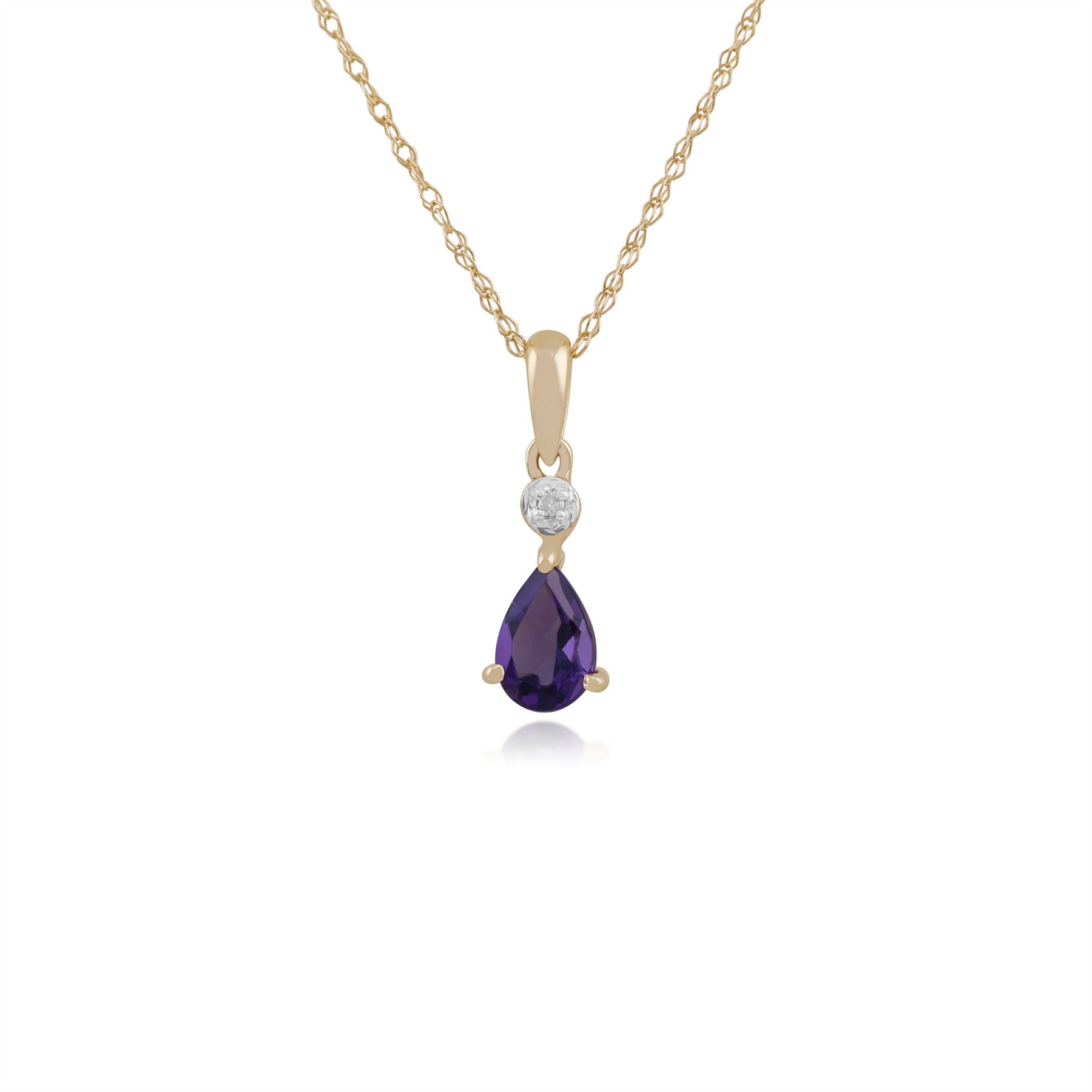 A stunning pendant, crafted from yellow gold, featuring a pear shaped amethyst gemstone with a sparkling white diamond above. This pendant comes with a matching 9ct yellow gold 45cm / 18inch chain. Amethyst Information: Number of Stones: 1 Stone Shape: Pear Stone Size: 6mm x 4mm Carat Weight: 0.36ct Natural/Created: Natural Amethyst Country of Origin: Brazil diamond Information: Number of Stones: 1 Stone Shape: Round Stone Size: 0.90mm Carat Weight: 0.004ct Natural/Created: Natural diamond Country of Origin: India