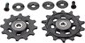 Derailleur pulley set includes upper and lower pulleys with bearing plates