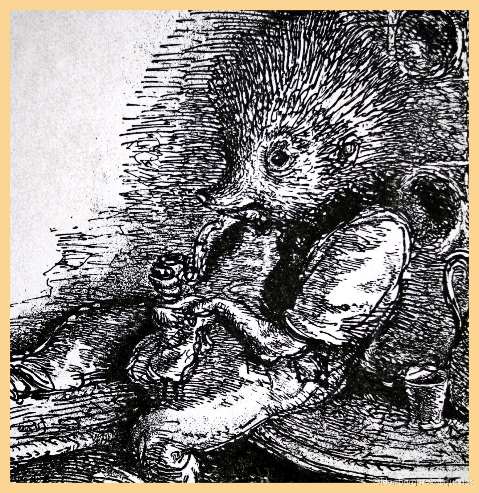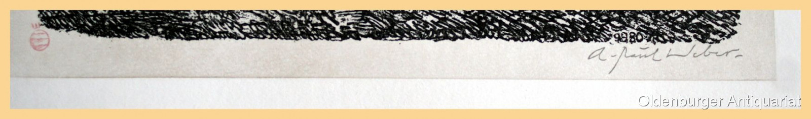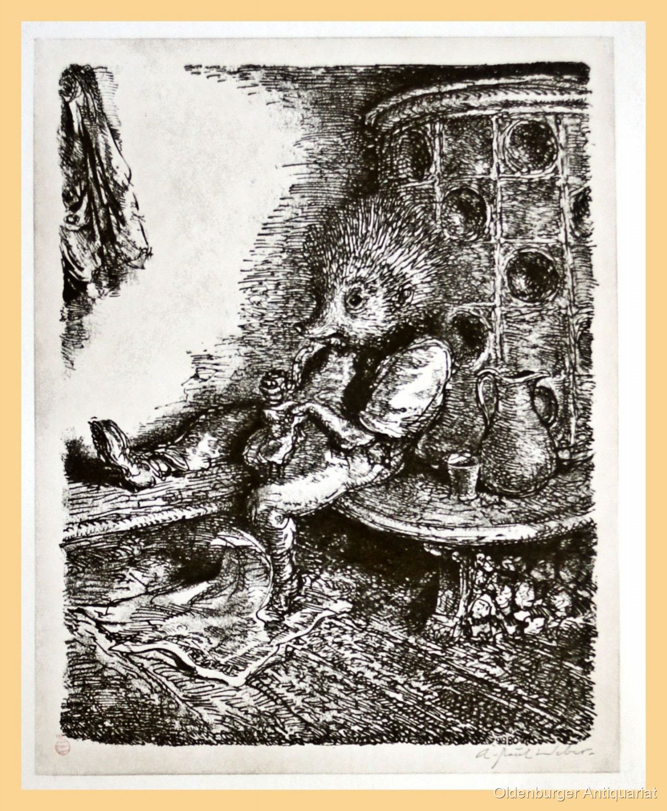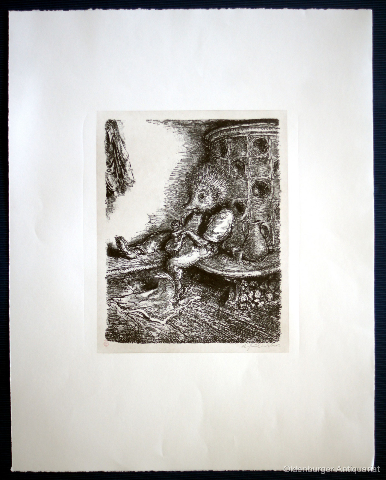 A. Paul Weber: "Auf der Ofenbank". Original-Lithographie aus dem Zyklus "Aus Igelhausen". Bildgrösse:: 33,5 x 26,5 cm, Blattgrösse: 64,5 x 51 cm. Minimal knittrig, sehr gut erhalten. Von A. Paul Weber mit Bleistift signiert, links unten zudem der kleine rote Stempel mit dem "W", rückseitig mit einem Stempel bezeichnet "Nachlass A. Paul Weber", darunter signiert von Christian Weber, also ein posthum aus dem Nachlass verkauftes Blatt. Ein dekoratives, stimmungsvolles Blatt mit dem Pfeife rauchenden Igel. Original, kein Nachdruck, für die Echtheit wird garantiert! Ebay Sonderpreis!