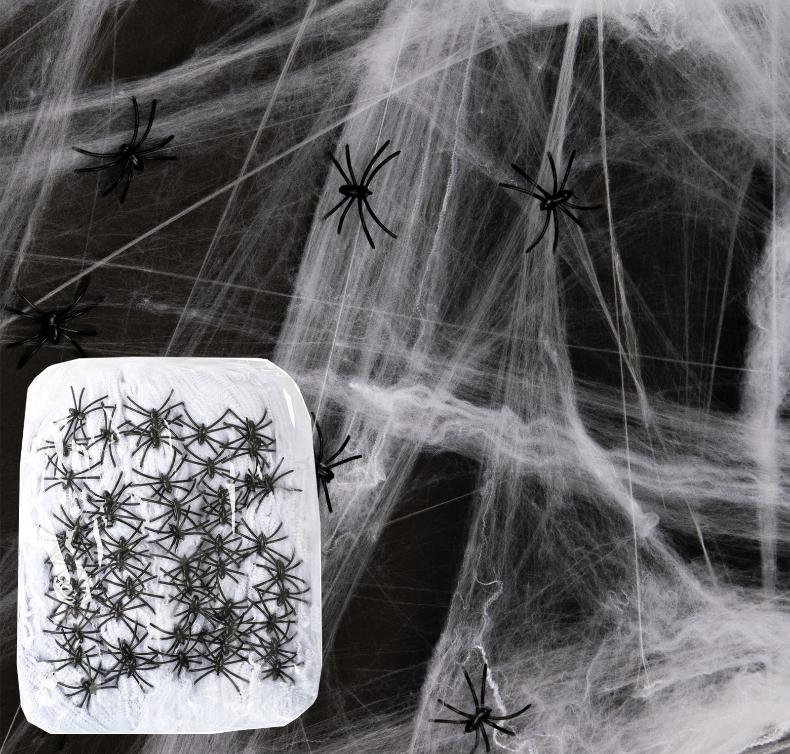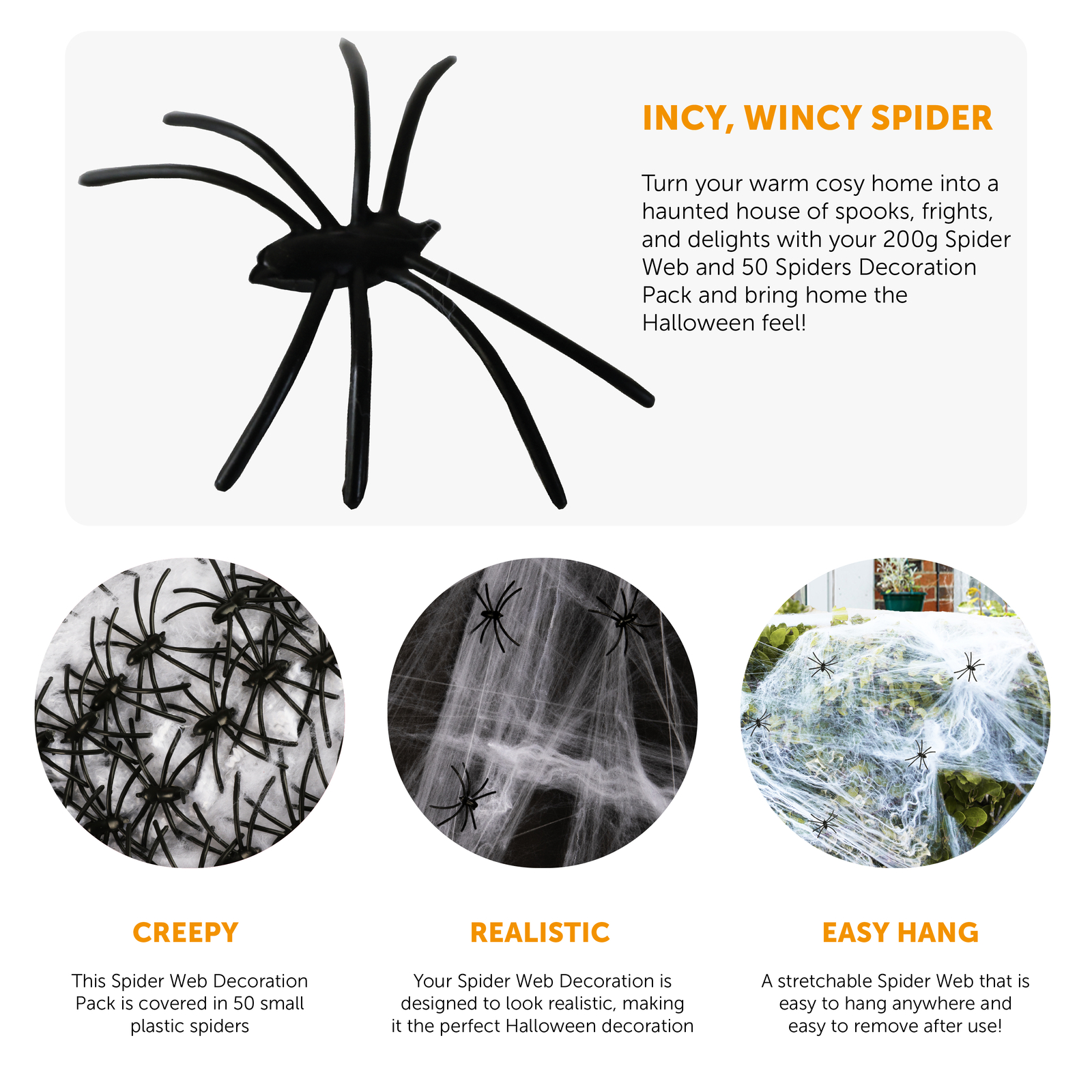 SPIDER WEB DECORATION AND SPIDERS PACK: Turn your warm cosy home into a haunted house of spooks, frights, and delights with your 100g or 200g Spider Web and 25 or 50 Spiders Decoration Pack and bring home the Halloween feel!