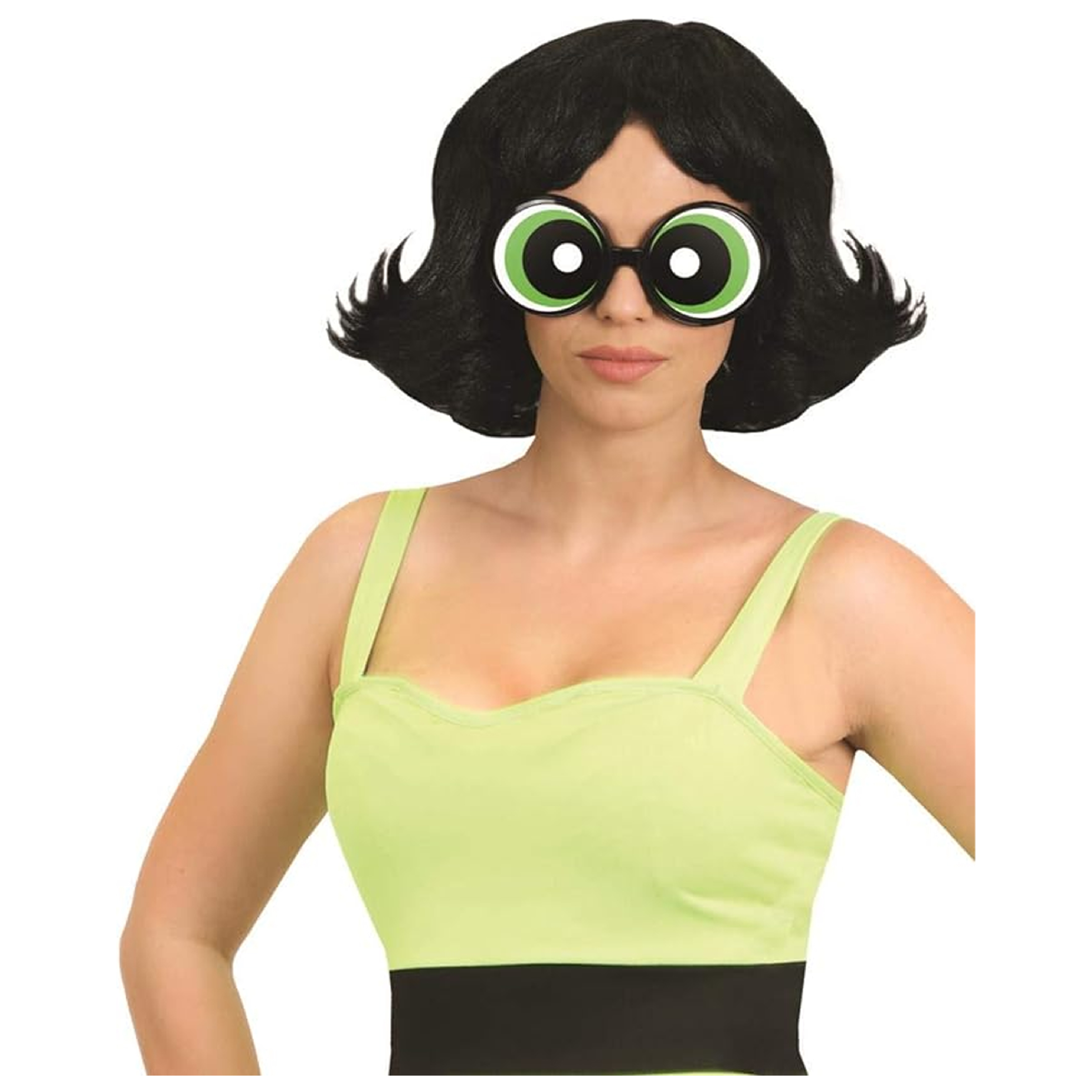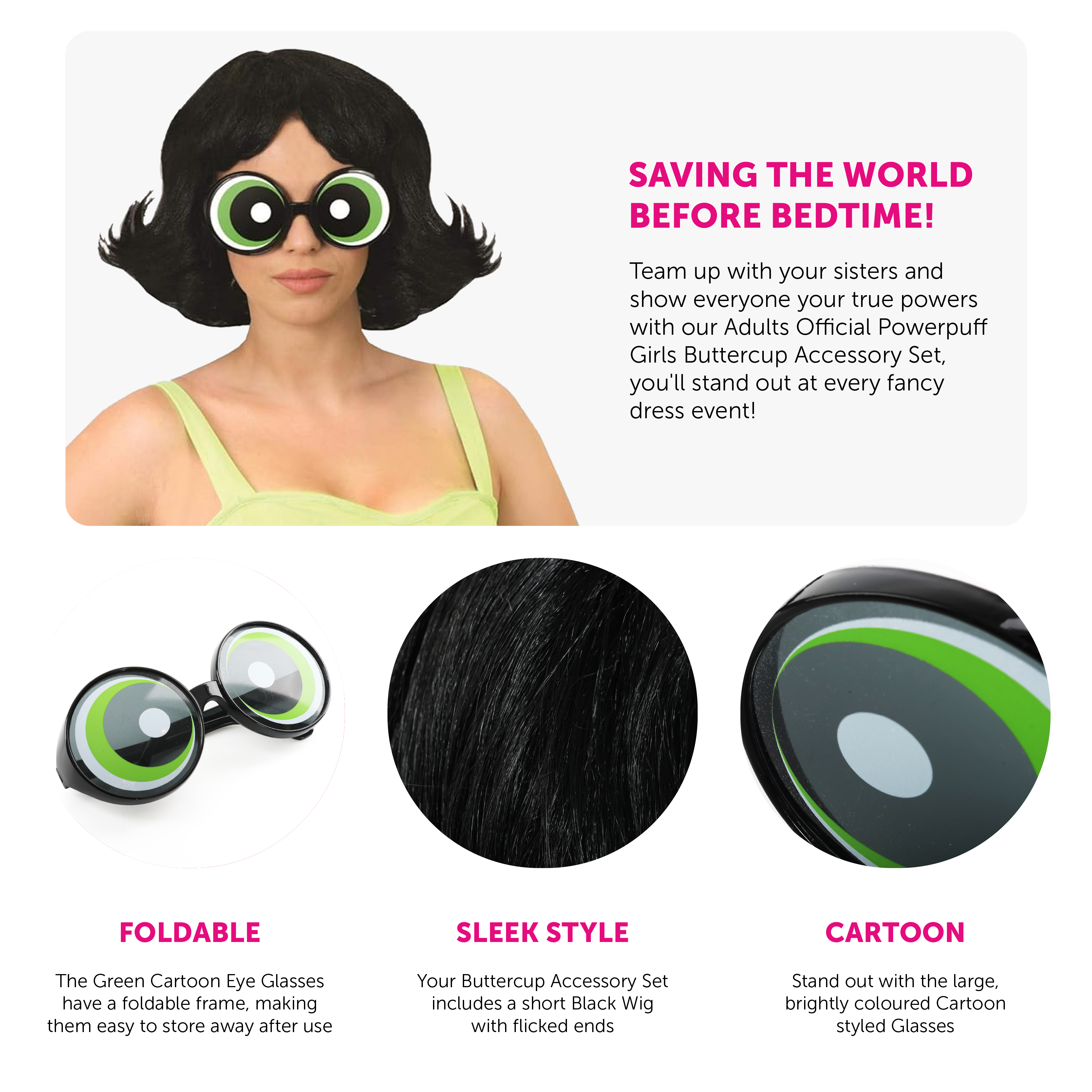 SET INCLUDES: Your 90's Power Girls Buttercup Accessory Set includes a Short Black Wig and a pair of Green Cartoon Eye Glasses, the perfect accessory Set to get you into character for any fancy dress party!