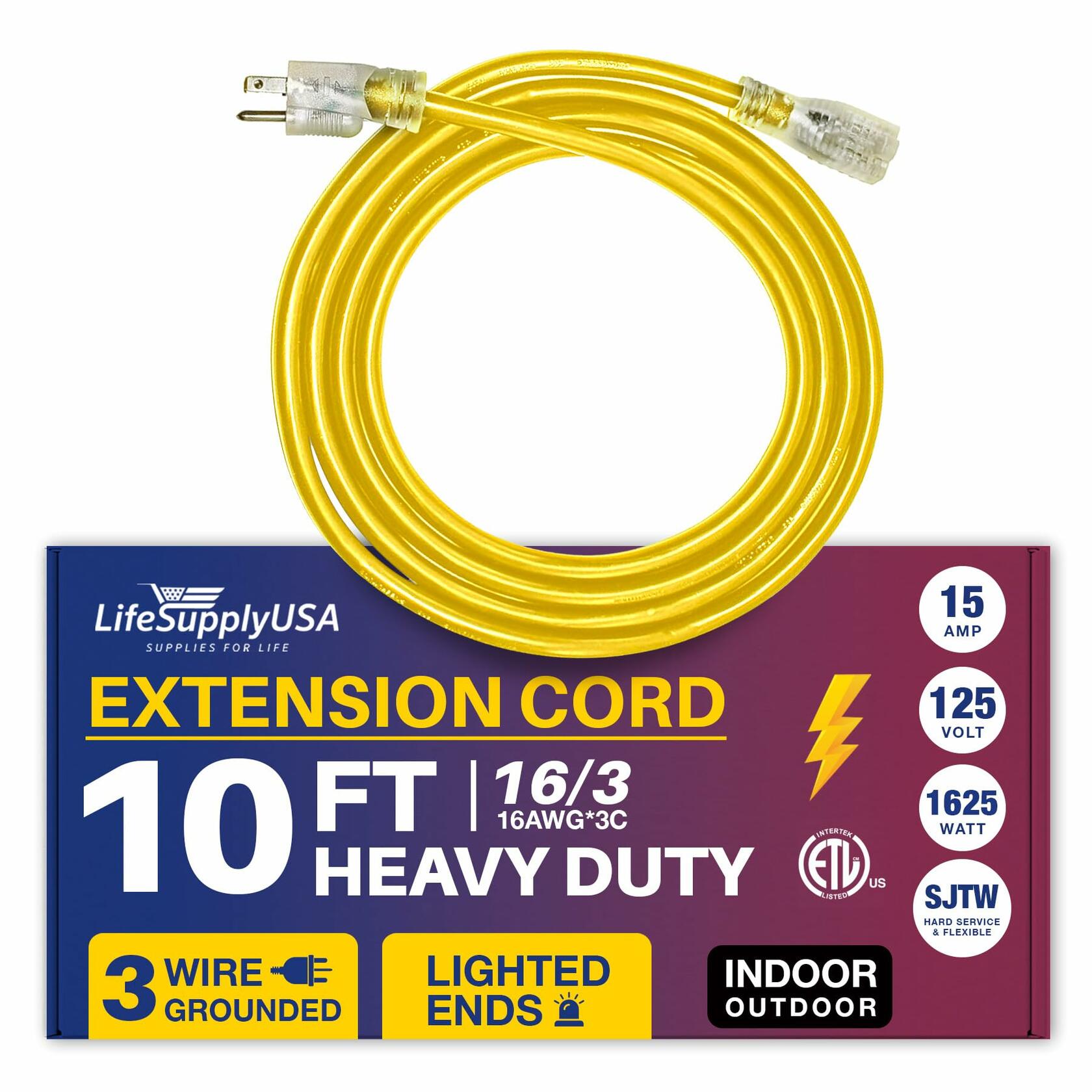 POWERFUL & ETL LISTED CERTIFIED: This 10FT, 16 Gauge 3-prong SJTW, Yellow extension cord is designed for extra safety and durability, The cable extension electrical cord supports 13AMP, 125 Volts, and up to 1625 Watts, ensuring robust performance for high-demand equipment. ETL listed for compliance with North American safety standards, this 1 Pack embodies reliability, quality, and the grounded power to handle your most challenging projects with ease.
