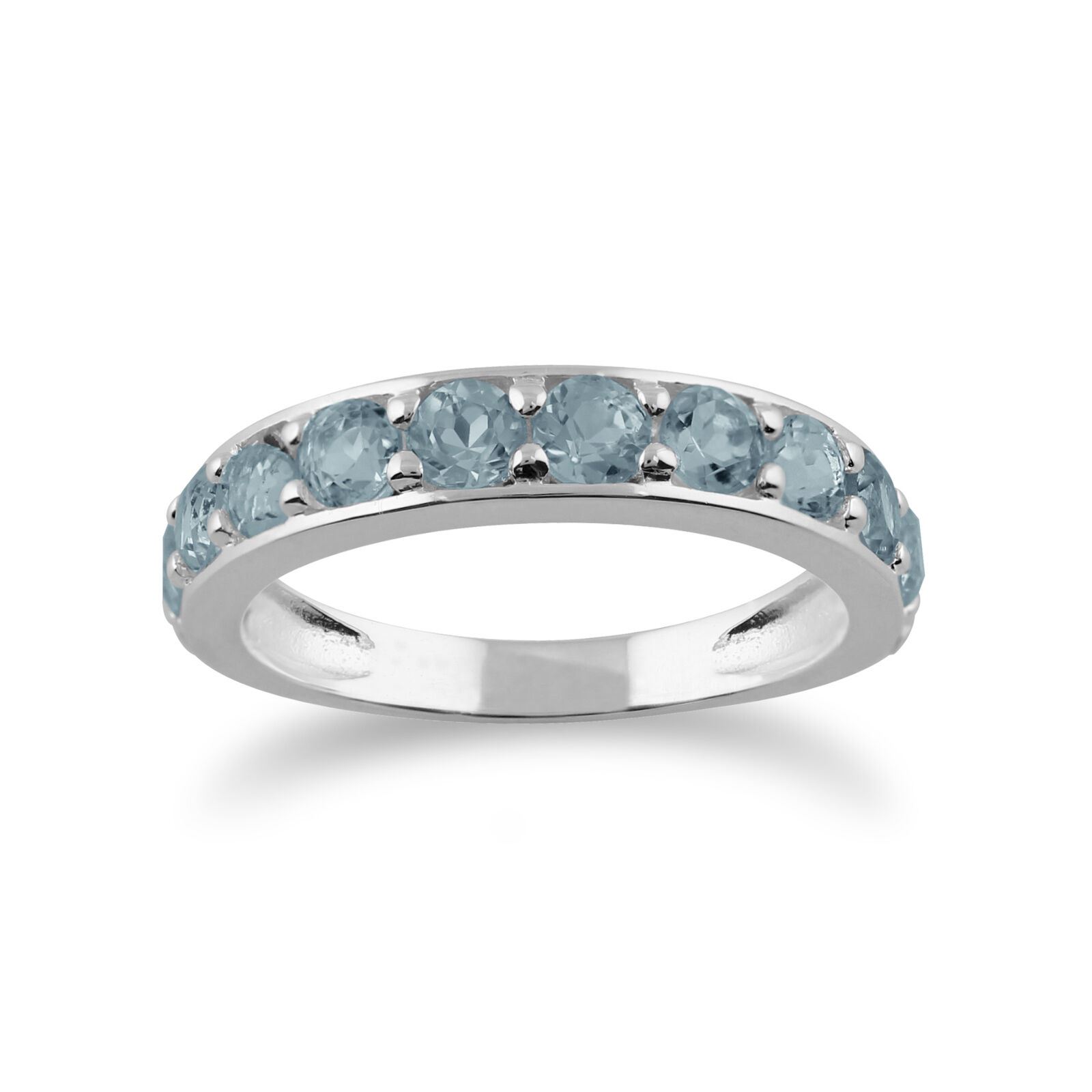 A stunning half eternity style ring crafted from sterling silver set with twelve stunning round cut faceted blue topaz gemstones.