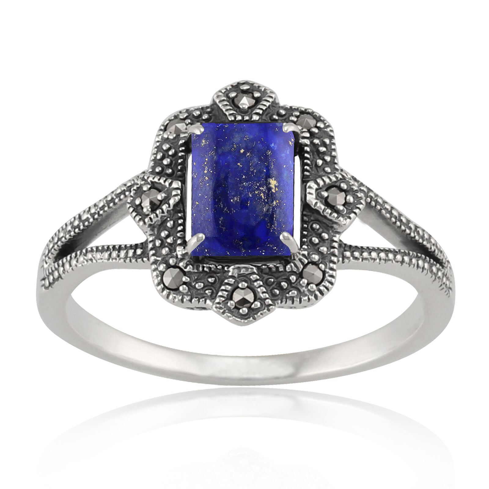 Un impresionante anillo clásico de estilo Art Deco elaborado con plata esterlina con una piedra preciosa lapislázuli facetada en forma de baguette enmarcada con piedras preciosas Marcasite brillantes