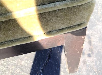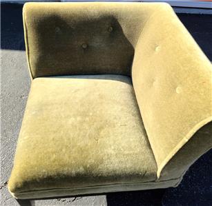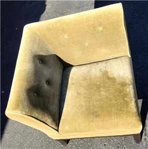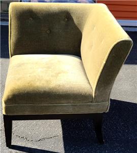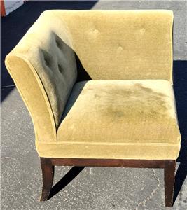Offered here is this Beautiful Vintage Ladies Corner Chair. I am unsure of the age or origins of the chair. It is upholstered in a green plush material and is in very good condition. The upholstery is in very good condition, with no holes or tears, and only some light wear to the plush pile. The solid wood legs of the chair have a lot of surface scratches and dings on them from general use. The back and side of the chair are lightly tufted. The chair is 30” tall, 28” long, 27” wide across the front, 21.5” deep at the seat, 18” high at the seat. It is a beautiful vintage ladies corner chair that would be a nice addition to your antique collection and is in usable condition as well. It is a very nice accent piece.
