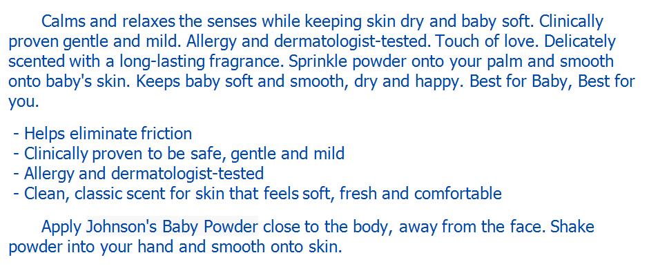 | | | JOHNSON s BABY POWDER Gentle Classic Lasting Skin Comfort 200G. | Shipping Details: - The item will be shipped worldwide next business day after the money has been transferred to my Paypal account and you should received in 2-4 weeks. The item will be posted by airmail from Thailand in well package and send by Non-Registered airmail.