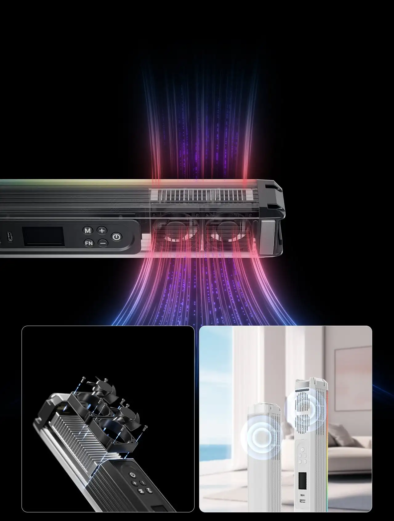 Fans will work at high output levels for heat dissipation. And fans can also be turned off by long pressing FN button when sound-sensitive environments are needed. Intensity of the light will decrease to 30%.