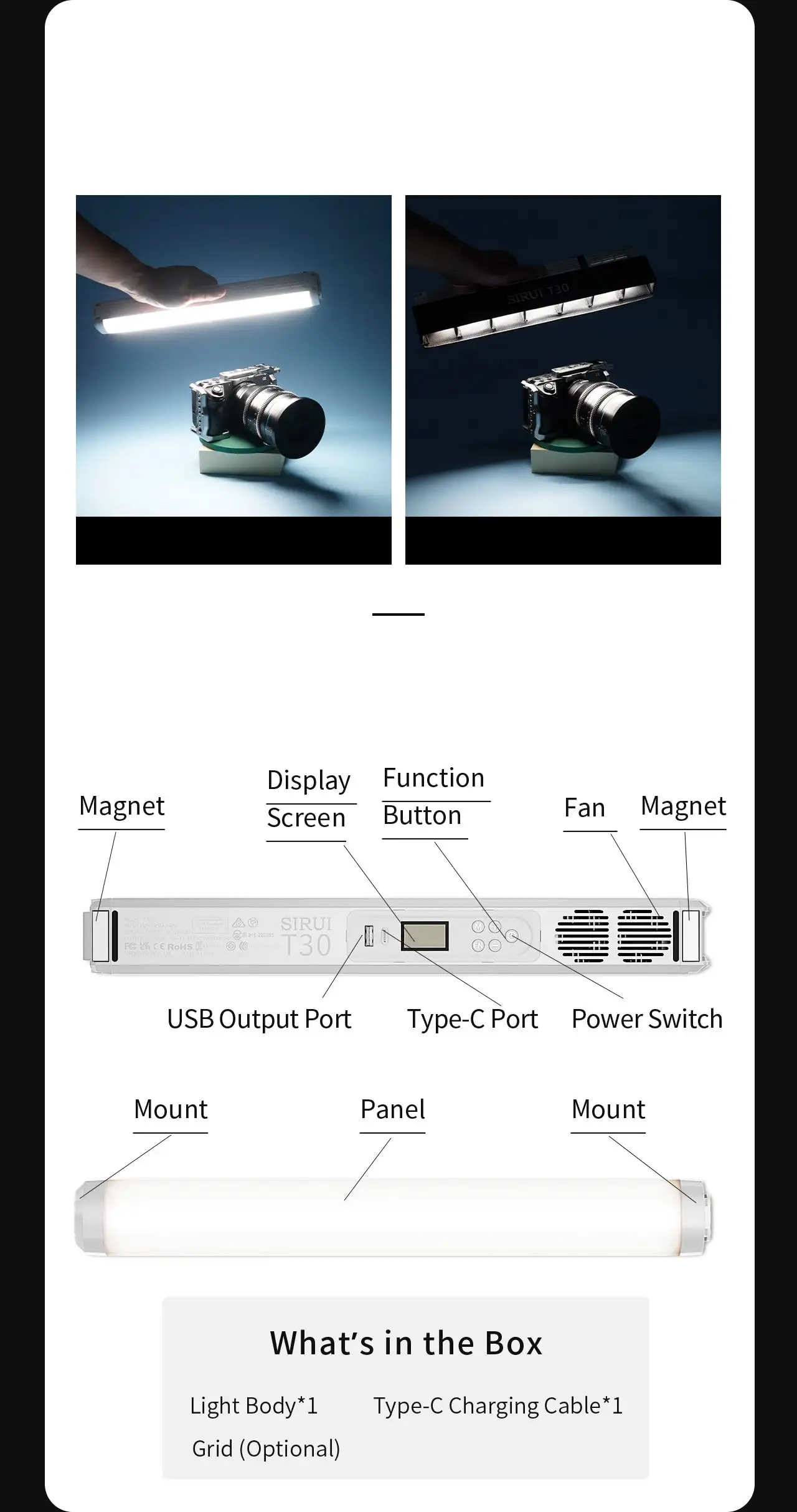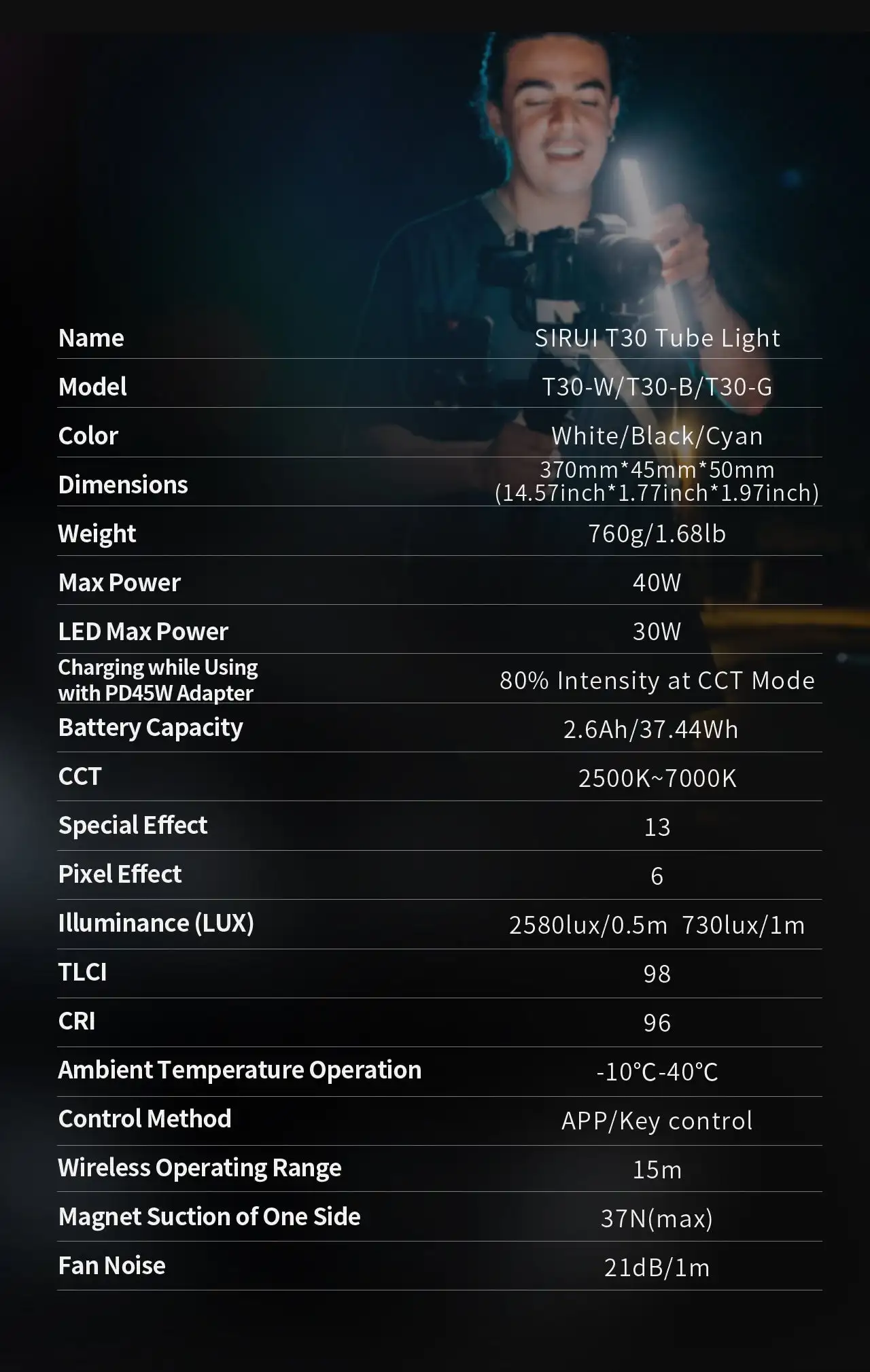 This compact and portable SIRUI T30 Tube Light is designed into three colors, white, black and cyan. Compared with similar products, it is more powerful and brighter, which can be used as supplementary lighting source in low-light environment or create indirect lighting effects. Besides, it is suitable for portrait, wedding, still life, etc.