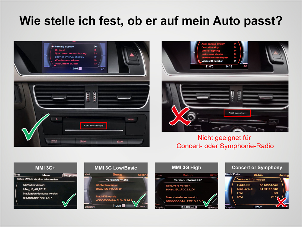 - Nur für Fahrzeuge mit "Multimedia" Radio und MMI 3G Basic, MMI 3G Low, MMI 3G High oder MMI 3G+ High Bediensystem ab Werk!