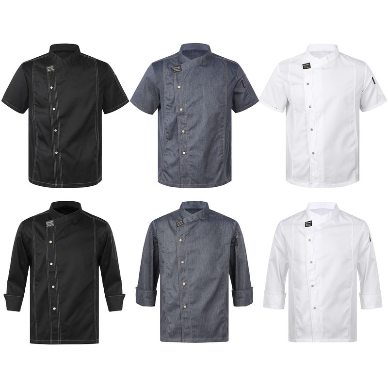 Es gibt zwei Stile: Kurzarm- und Langarmjacke, und die Seiten der Kurzarmjacke sind mit atmungsaktivem Netzgewebe versehen, das Sie in der heißen Küche kühl hält.