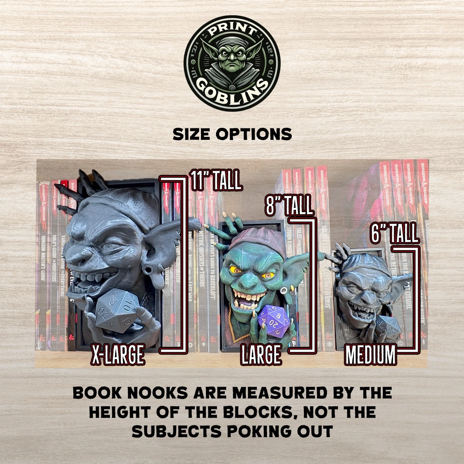 Nooks are measured by the height of the block, not the overall height of the design. This ensures consistency of the nooks regardless of the figure. See the size chart in the images for reference.