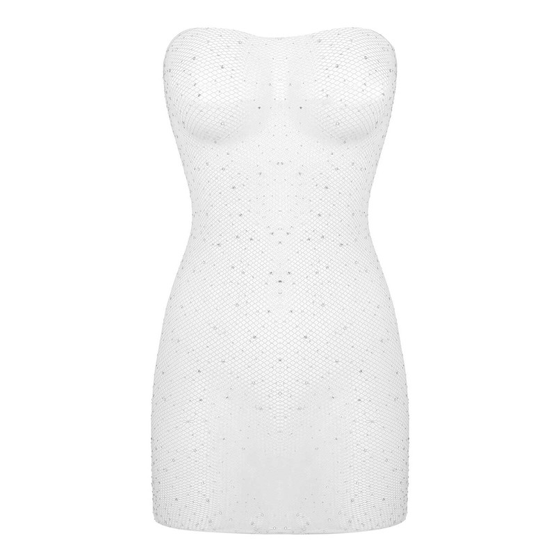 Strapless and hollow out netted design with shiny rhinestones, seamless tube dress lingerie, pull on closure.