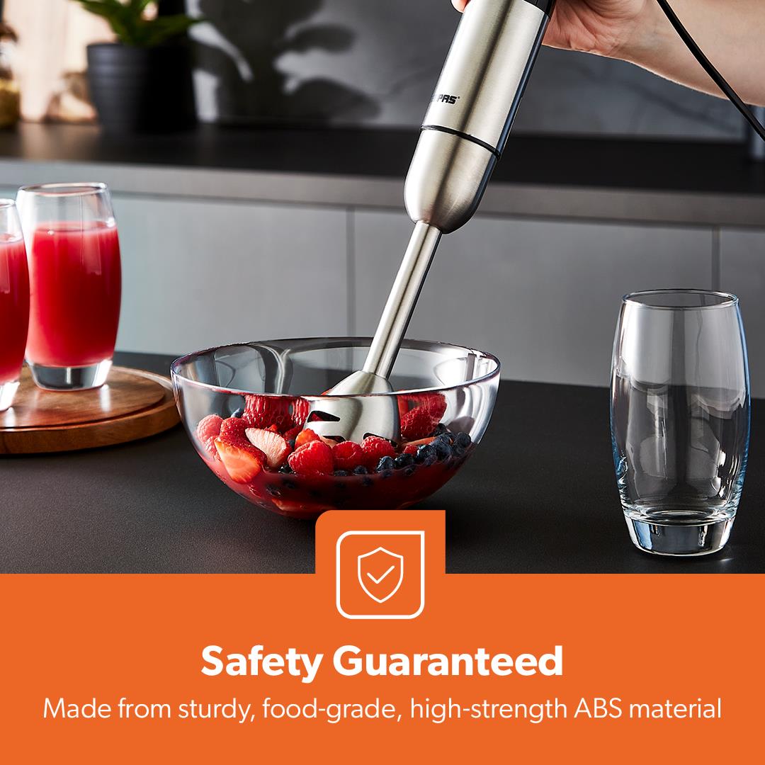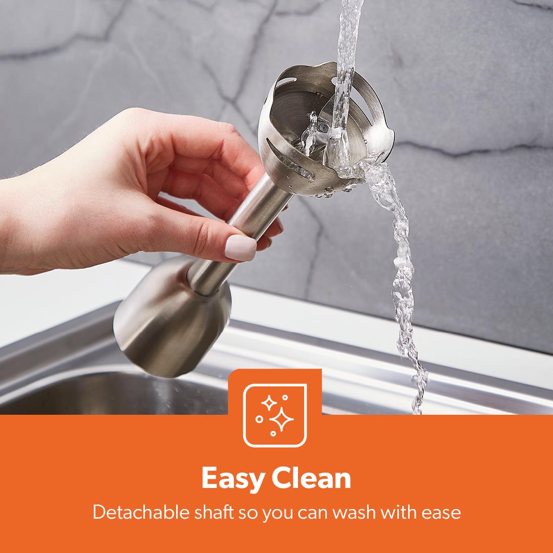 ✅ ANTI SPLASH STAINLESS STEEL BLADES - The high-quality stainless steel blades of this handheld/stick blender allow for easy, efficient blending and reduce suction. Start blending the easy way - simply with one touch! Whether you mix, or create deliciously healthy smoothies and shakes, blend hearty soups, puree baby foods and so much more the blade processes your ingredients thoroughly.