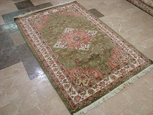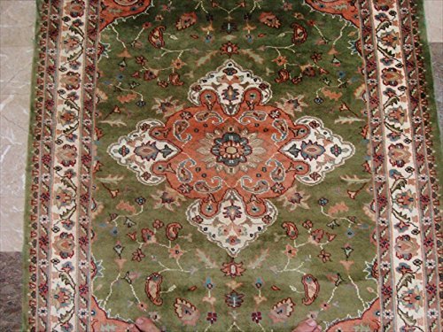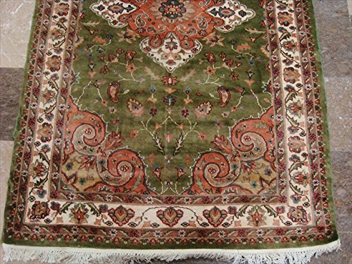 Lovely Olive Green Medallion Rectangle Area Rug Hand Knotted Wool Silk Carpet (6 X 4)'. Add a classic look in your home with this rug. For the perfect combination of unique, beautiful style and high-quality durability, the attention to detail on these beautiful contemporary rugs is noticed as soon as you lay eyes on the carpet. The rug to appear dull when viewed from one side, and shiny from the other side. Please view the picture at the bottom to see the bright side of the rug. This rug can help brighten up a room if you do not get much sunlight. Simply put the bright side facing the seating area and it will make the room appear surprisingly bright. Blended color schemes match well with all styles of furniture and art. Give your home an elegant touch with this area rug. Great for any decor, adds texture to the floor and complements any decor. 100% Genuine Hand Knotted-Rug not hand tufted.