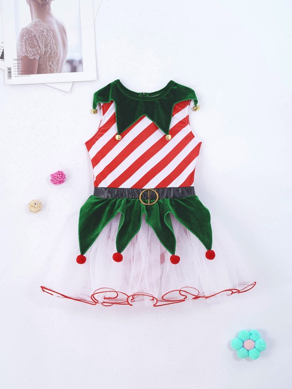 Kids Girls Stripes Print Inverted Triangle Hem with Bells Pom Pom Mesh Tutu Dress.