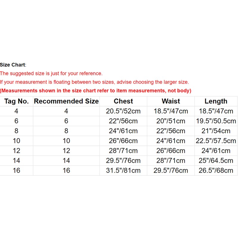 | Tag No. | Recommended Size | Front Length | Chest | Waist |