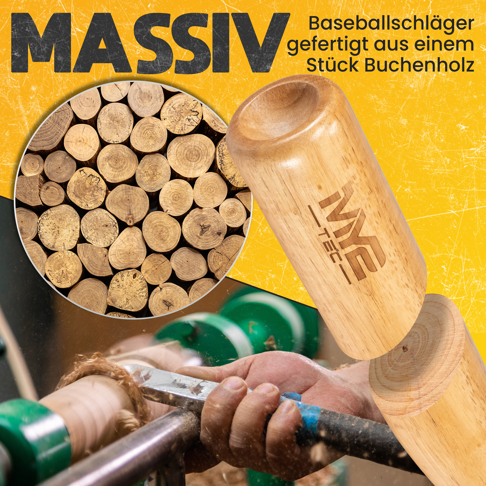 Kompakt und massiv - Baseballkeule aus Massivholz als Alleskönner im Baseball Sport und zuverlässiger Begleiter im Alltag. Baseball-Keule wurde aus einem Stück Buchenholz gefertigt und zeichnet sich durch besonders bequeme Handhabung und handliche Größe aus