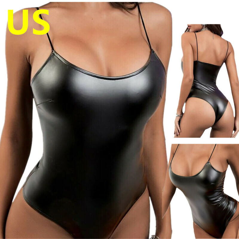 Womens Spaghetti Strap Scoop Neck Bodysuit High Cut Sleeveless Faux Leather Catsuit.