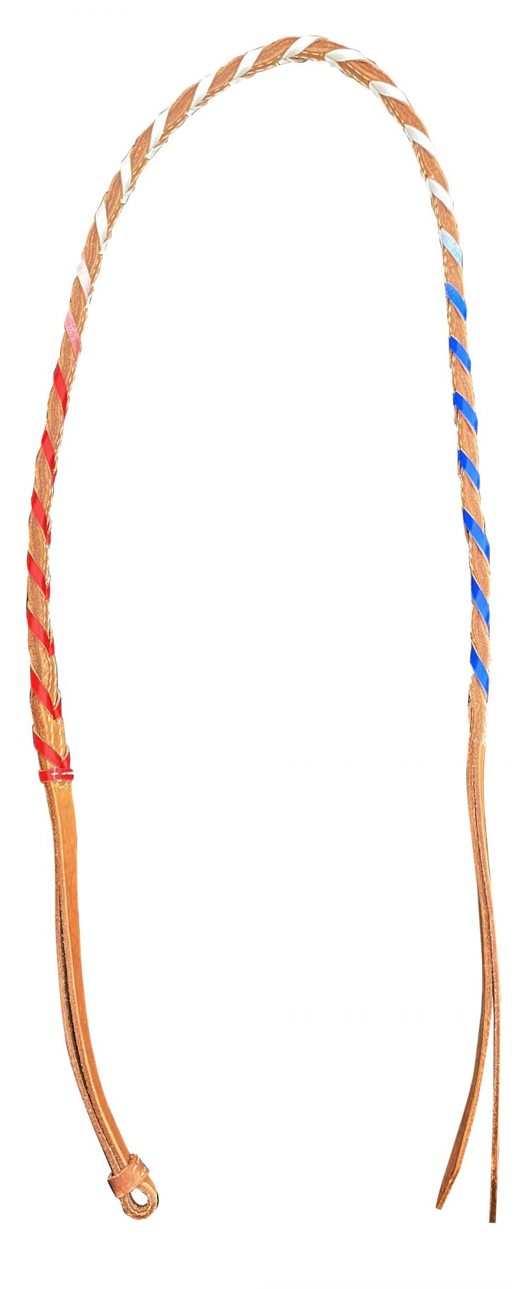 Showman Argentina Cow Leather Over & Under Whip w/ Red, White & Blue Lacing. This whip is constructed from Argentina cow leather and features red, white and blue lacing. Whip measures 4' long by 1/2" wide.