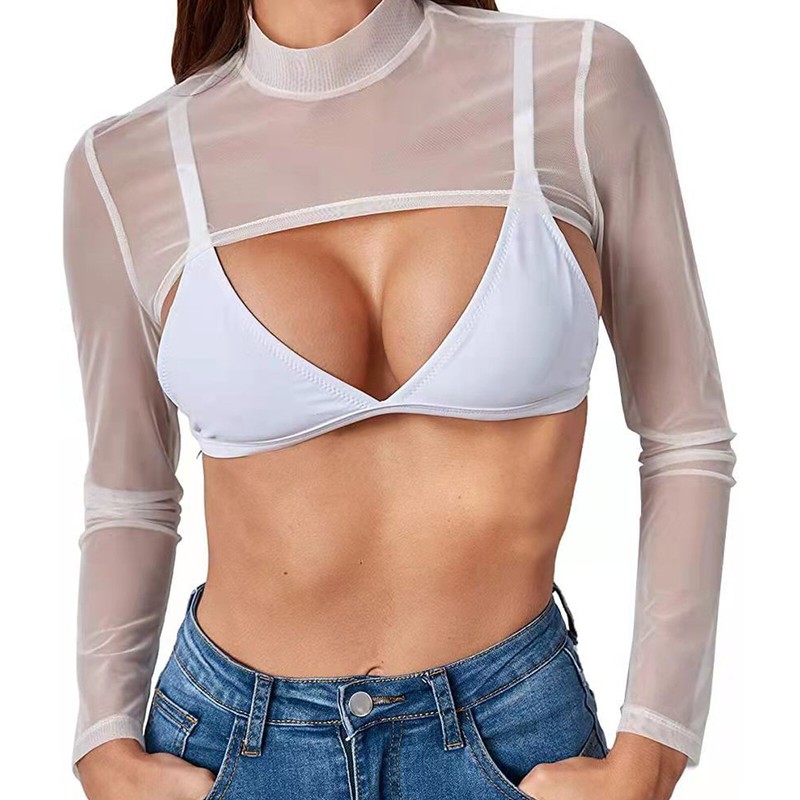 Womens See-through Mesh Crop Top Mock Neck Long Sleeve T-shirt Cover Ups.