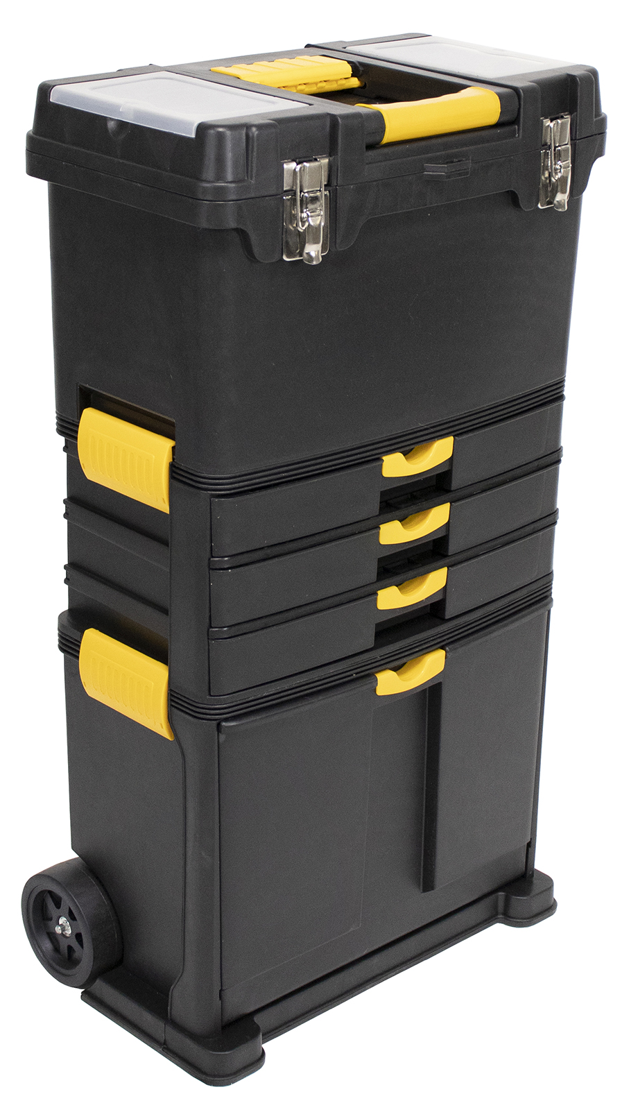 Overall Dimensions: 18” L x 32” H x 10-1/2” W with two (2) 4” wheels, auto-locking transport handle, and equipped with four (4) yellow latches to secure and release the three (3) tiered toolbox.
