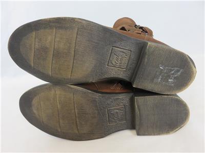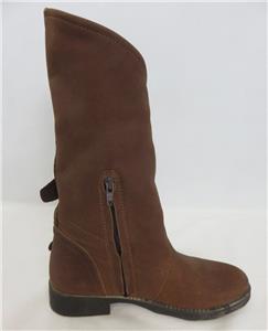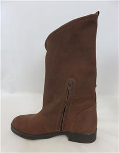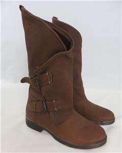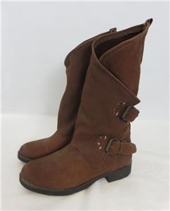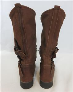 We are offering a pair of edgy Coolway Aida suede chestnut moto boots with buckles & wrap-around front. Pull-on, ankle zipper, mid-calf height. Made In Spain. SZ EU 37 US 7.