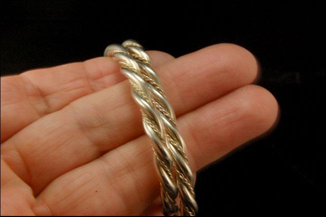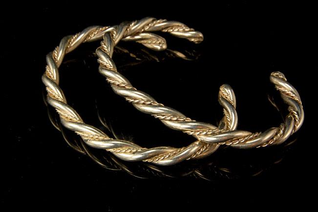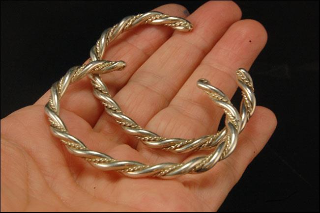 These are 2 beautiful and vintage STERLING SILVER c. 1980 cuff bracelets (weight 35.6g). The collection has wonderful rope designe and sterling silver. They are measure 5 3/4". The 2 bangles are in very good condition.