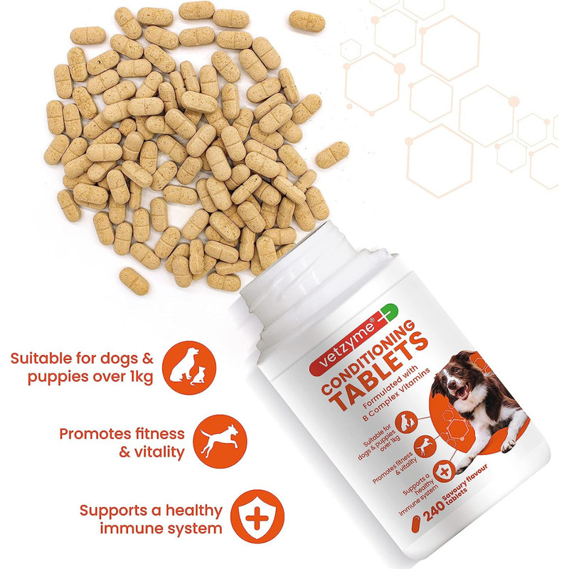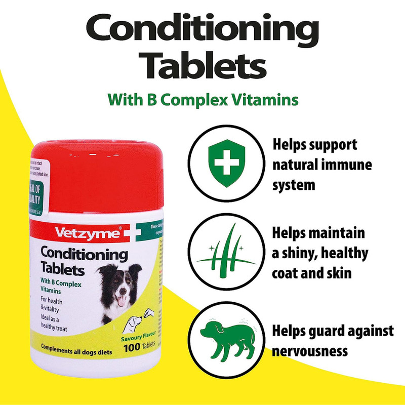 Vetzyme Conditioning Tablets for Dogs complement all diets. They are crammed full of vitamins and minerals including B Complex, a very important and essential group of vitamins for dogs, as they guard against nervousness, promote a healthy coat and skin and contribute towards general health and vitality. Keep your dog in optimum condition with these conditioning tablets. Suitable for dogs in all life stages in times of need such as illness, stress & pregnancy.