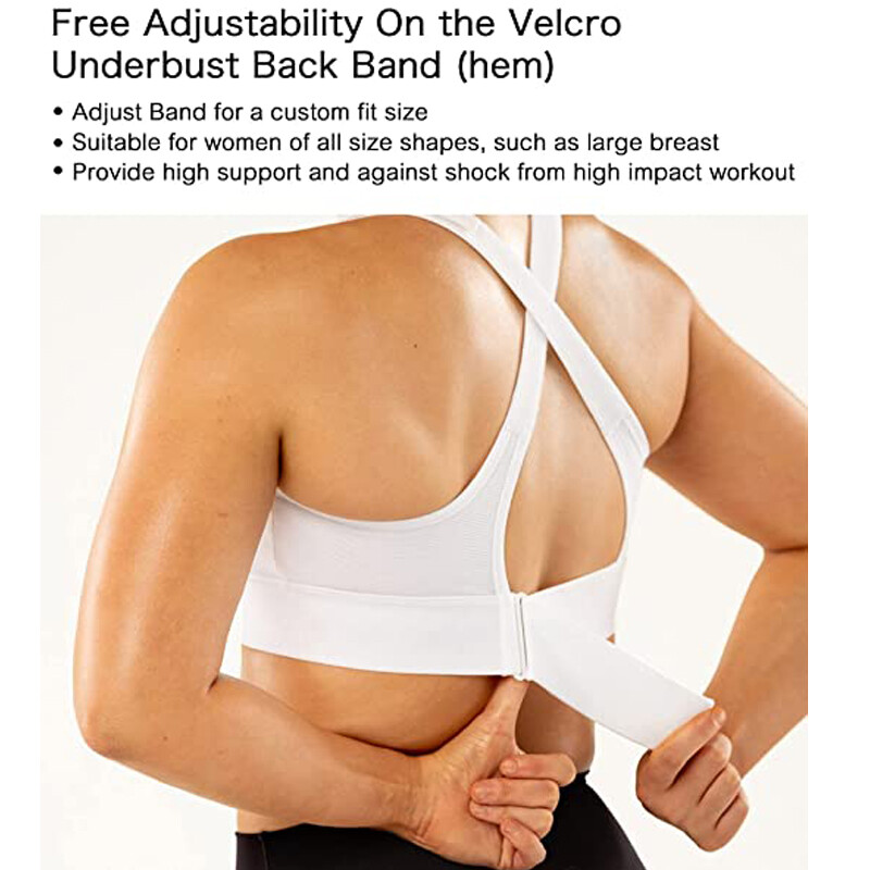 ► Unique Hook&loop Technology Free Adjustability On the Underbust Band: The sports bra designed to give women the ability to adjust the velcro wide hem for a custom fit, suitable for women of all size shapes, such as large breast . The yoga bra with adjustable velcro hem also can effectively protects against shock from medium or high impact workout, that goes where no other running bra has gone before.